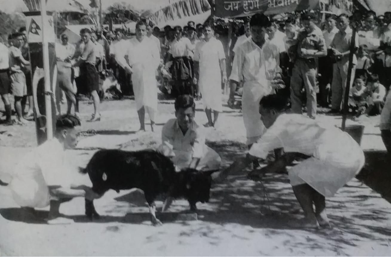 從前十勝節,在印度廟附近空地進行血祭儀式,山羊為祭品。 Nam Sing Thapa 提供圖片
