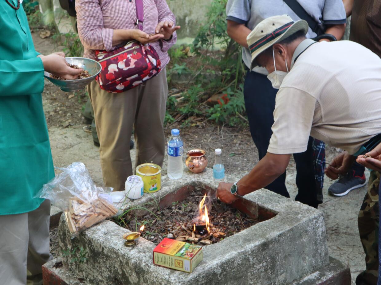 廟外進行火供儀式,右為退休啹喀兵 Nam Sing Thapa。