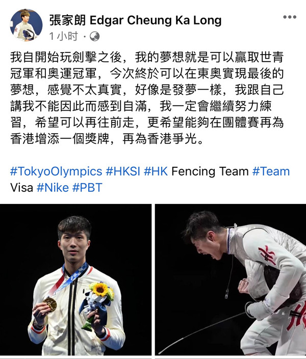 東京奧運會男子花劍個人決賽上演,中國香港選手張家朗擊敗意大利名將加羅佐,為中國香港贏得本屆奧運會首枚金牌。27日,張家朗在fb上發文表示,我自開始玩劍擊之後,我的夢想就是可以贏取世青冠軍和奧運冠軍,今次終於可以在東奧實現最後的夢想,感覺不太真實,好像是發夢一樣,我跟自己講我不能因此而感到自滿,我一定會繼續努力練習,希望可以再往前走,更希望能夠在團體賽再為香港增添一個獎牌,再為香港爭光。(圖源:fb、新華社)