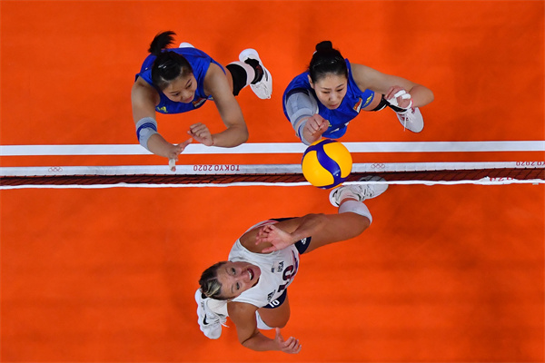 女排小組賽中國隊不敵美國隊,圖為中國隊球員龔翔宇(上左)、顏妮(上右)在比賽中防守美國隊球員拉森。新華社