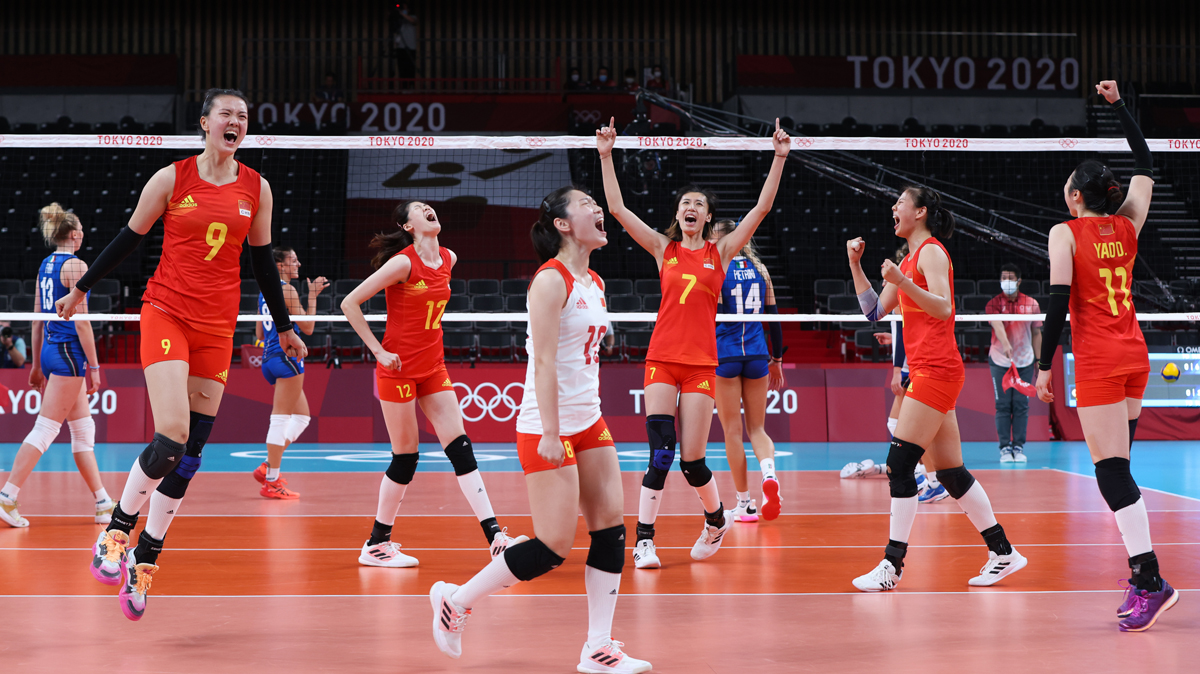 女排小組賽,中國戰勝意大利。圖為中國隊球員在比賽中慶祝得分。新華社