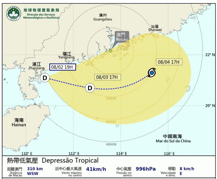 澳門氣象局表示,位於廣東西部沿岸的低壓區已發展為熱帶低氣壓,預料該熱帶低氣壓未來2、3日將橫過南海北部,為廣東沿岸帶來不穩定天氣,期間澳門間中有大驟雨及雷暴。呼籲市民留意最新風暴消息。