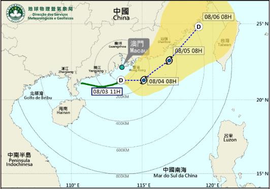 澳門今日(3日)下午1時改發3號風球。澳門氣象局表示,位於珠江口以南的熱帶低氣壓持續增強,中午時位於澳門以南約80公里,以時速5公里東北偏北緩慢移動,預料3號風球將在日間維持,改發8號風球的機會低。