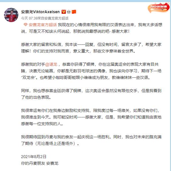 贏得金牌後,安賽龍今日在微博用中文發出公開信,在信的署名還用上「你的丹麥朋友」,獲得不少中國球迷畀讚,並且向他送上祝賀。