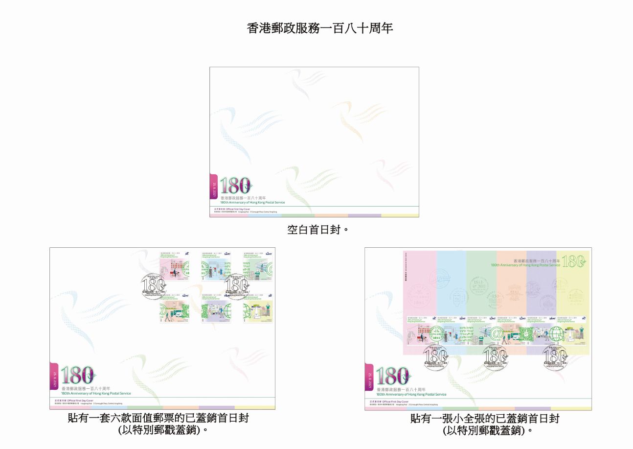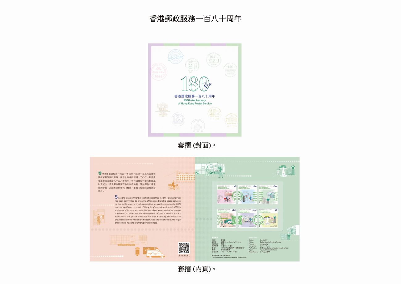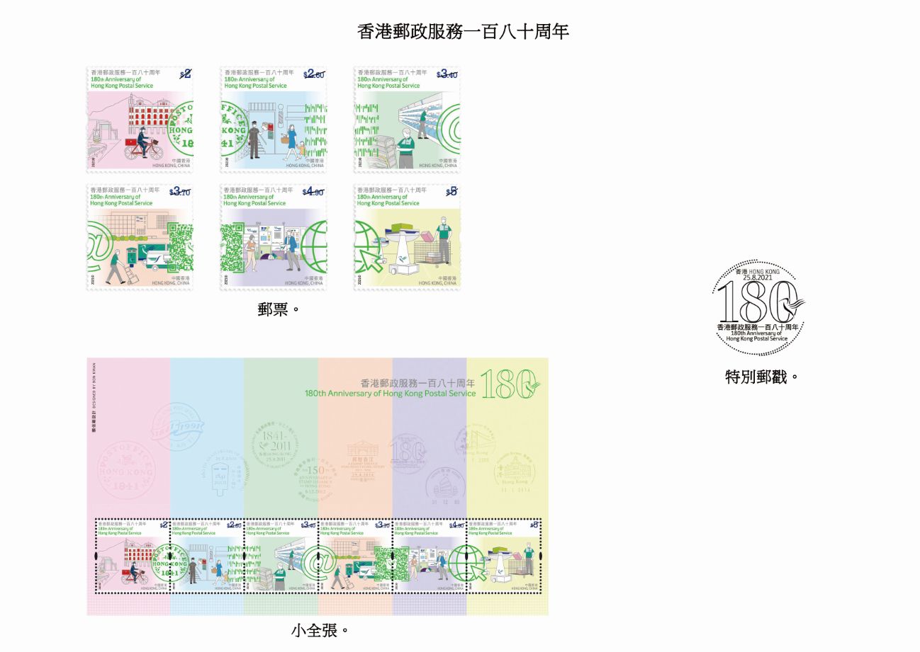 香港首間郵政局於1841年啓用,此後一直為市民提供快捷可靠的郵政服務。2021年適逢香港郵政服務踏入180周年,香港郵政將於8月25日發行以「香港郵政服務180周年」為題的紀念郵票及相關集郵品,以資紀念。