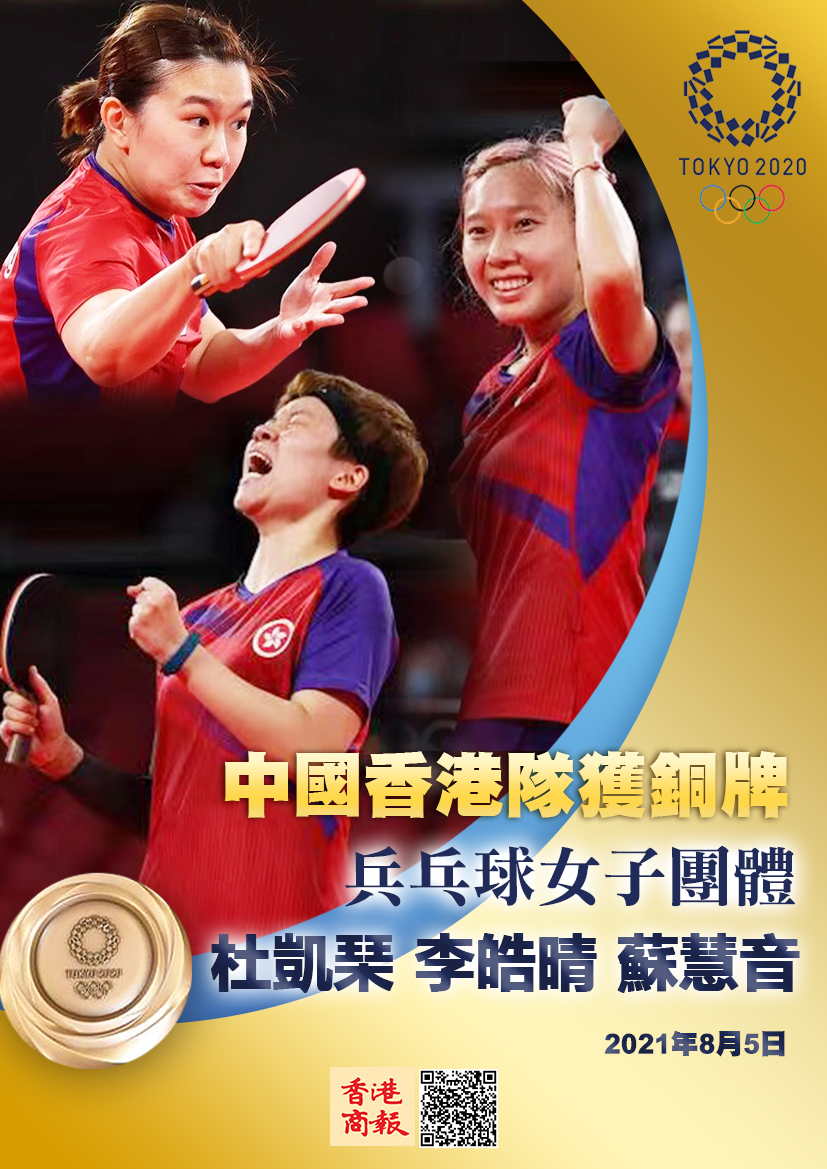 東京奧運女子乒乓團體賽,港隊以3比1力挫上屆銀牌得主德國隊,歷史性為香港取得首面團體銅牌, 香港特區行政長官林鄭月娥表示衷心祝賀。這是中國香港奧運代表隊今屆賽事取得的第四面獎牌;也是繼2004年雅典奧運會後,再次於奧運會乒乓球項目奪得獎牌。