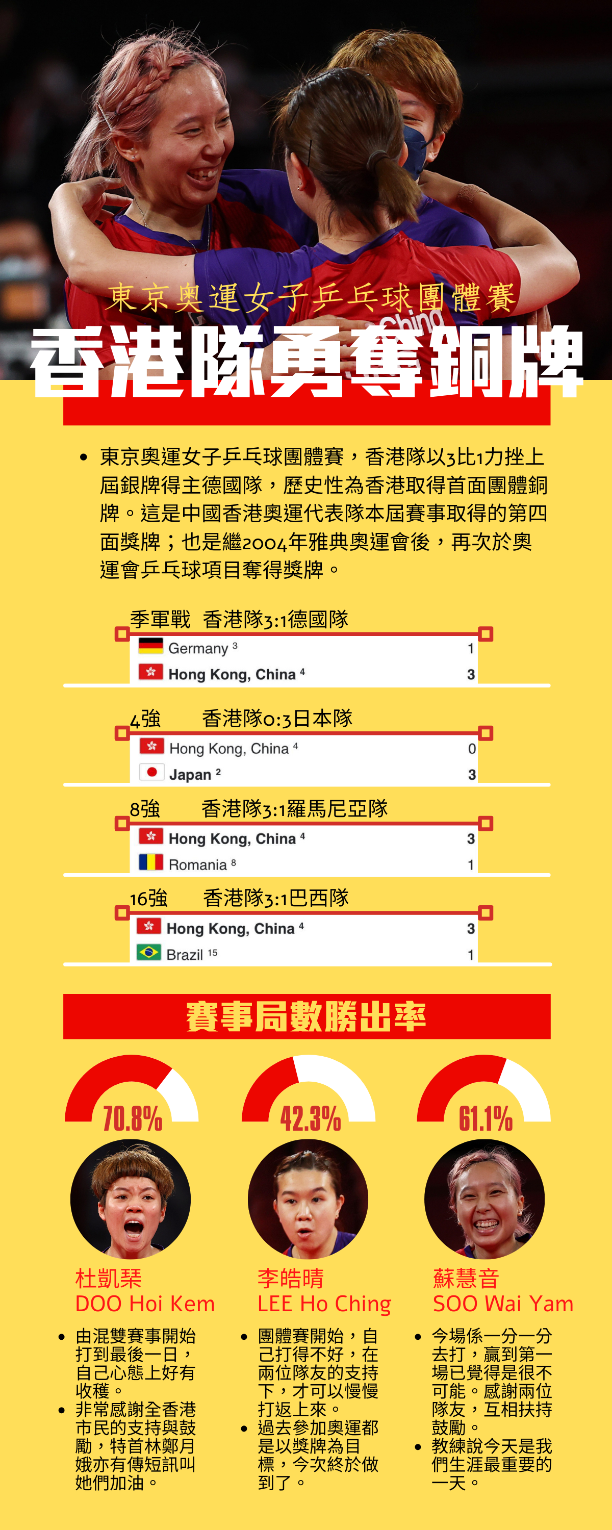 今次港乒女團3人都是香港土生土長的運動員,賽後蘇慧音表示,無想過能夠取得銅牌,說明「只要用心,一定做到」,她感謝兩位隊友的鼓勵和扶持;杜凱琹表示,今屆奧運經歷心情起伏,感謝市民對女團的支持;李皓晴稱,「心情有如坐過山車」,亦感謝隊友支持。