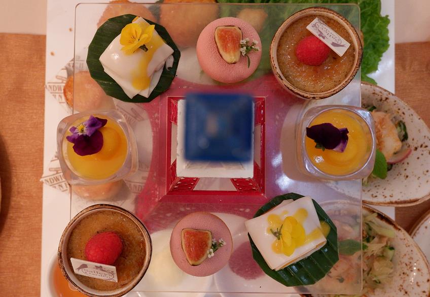另外尚有越南咖啡法式焦糖燉蛋、無花果慕絲蛋糕、斑蘭椰汁西米、芒果腸粉,當然少不了配上自家製玫瑰果醬及鮮奶油的提子鬆餅。不過貪吃的記者心想,如果能以帝苑餅店最受歡迎的迷你拿破崙和蝴蝶酥作結,就再好不過了。