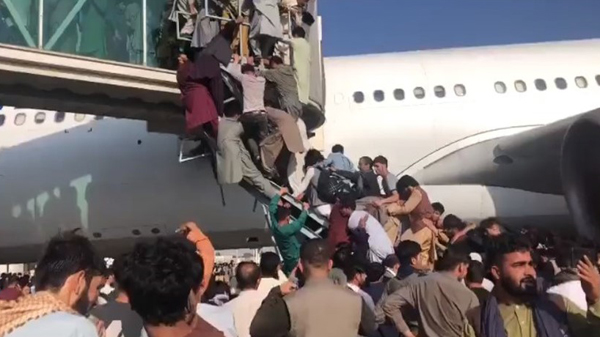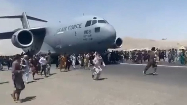 塔利班武裝進入喀布爾後,數以千計阿富汗民眾昨天淩晨摸黑闖入喀布爾國際機場跑道,他們拖著行李相互推擠,期盼擠上商業航班逃離阿富汗。社交平台多條影片顯示機場場面混亂,當中可見大批民眾在機場停機坪和跑道奔跑,有人爬上已擠滿人的登機橋,有人甚至半空懸吊,場面驚險,有在場美軍向天開槍示警。路透社引述目擊者稱,在機場死亡的5人未知是被槍殺還是在混亂中被踩死。另有慘烈視頻昨於網絡熱傳,有2名阿富汗人從已經起飛的美軍機上墜落,據報遺體已被尋獲。