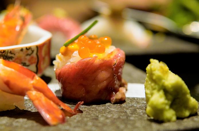 今年的「職人壽司」系列即日起至10月3日於全線分店供應,分兩個階段進行,第一階段即日起至9月7日供應。系列以奢華上乘魚鮮為主題,包括馬糞海膽配搭炙燒和牛、富山縣白蝦、慢煮龍蝦或大吞拿魚腩;吞拿魚頭蓋肉(腦天)、沖繩縣產車海老及北海道產特大珍寶帶子等,配以不同特級佐料匠心雕刻而成。每個階段會提供6款時令壽司,第一階段的壽司包括炙燒和牛馬糞海膽、馬糞海膽配白蝦、吞拿魚頭蓋肉(腦天)、真鯛伴鮟鱇魚肝西瓜奈良漬、車海老及池魚卷。其中,筆者最推介炙燒和牛馬糞海膽,馬糞海膽濃厚甘甜,輕燒過的和牛則脂香肉嫩,加上魚油鮮香的三文魚籽,建議一口吃下,才能體會層次豐富的口感。真鯛伴鮟鱇魚肝西瓜奈良漬是筆者另一心頭好,真鯛屬白身魚類的「百魚之王」,油脂適中,味道清淡,以酸香開胃的西瓜奈良和濃郁綿密的鮟鱇魚肝襯托,味道濃淡得宜。