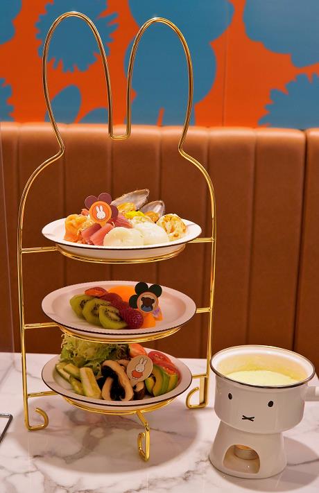 Miffy造型三層架有不少火鍋配料,包括大虎蝦、帶子、蟶子、青口、生果及蔬菜,配以四種芝士煮成的火鍋,食客更可以正價8折優惠加購特飲。