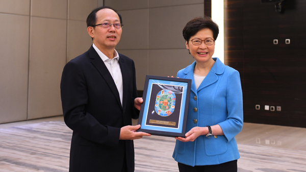 行政長官林鄭月娥26日在西安與國家體育總局局長苟仲文會面。圖示林鄭月娥(右)獲苟仲文(左)致送第十四屆全國運動會的紀念品。