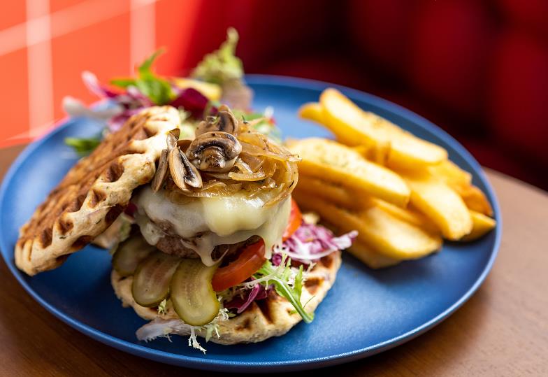 牛皇窩夫漢堡HK$158,窩夫以漢堡形式夾著免治牛肉漢堡扒,肉味香濃,配以風味醬汁。