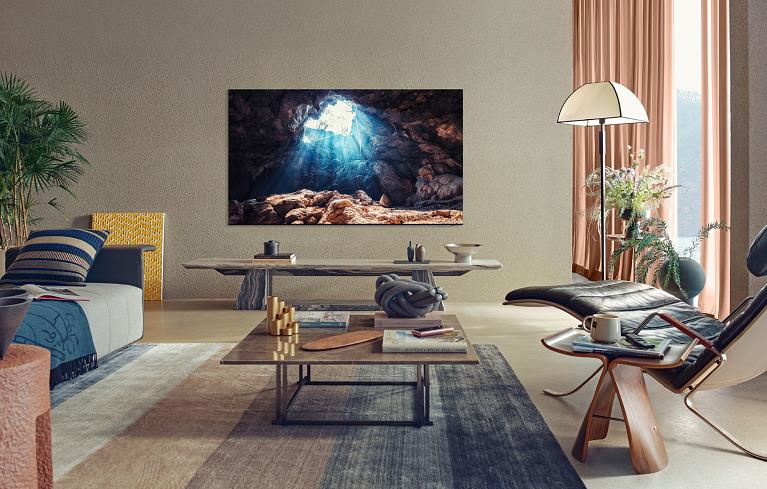Neo QLED電視外形優雅時尚,柔美線條配合微彎的機背,能輕易融入各種裝潢的家居風格。