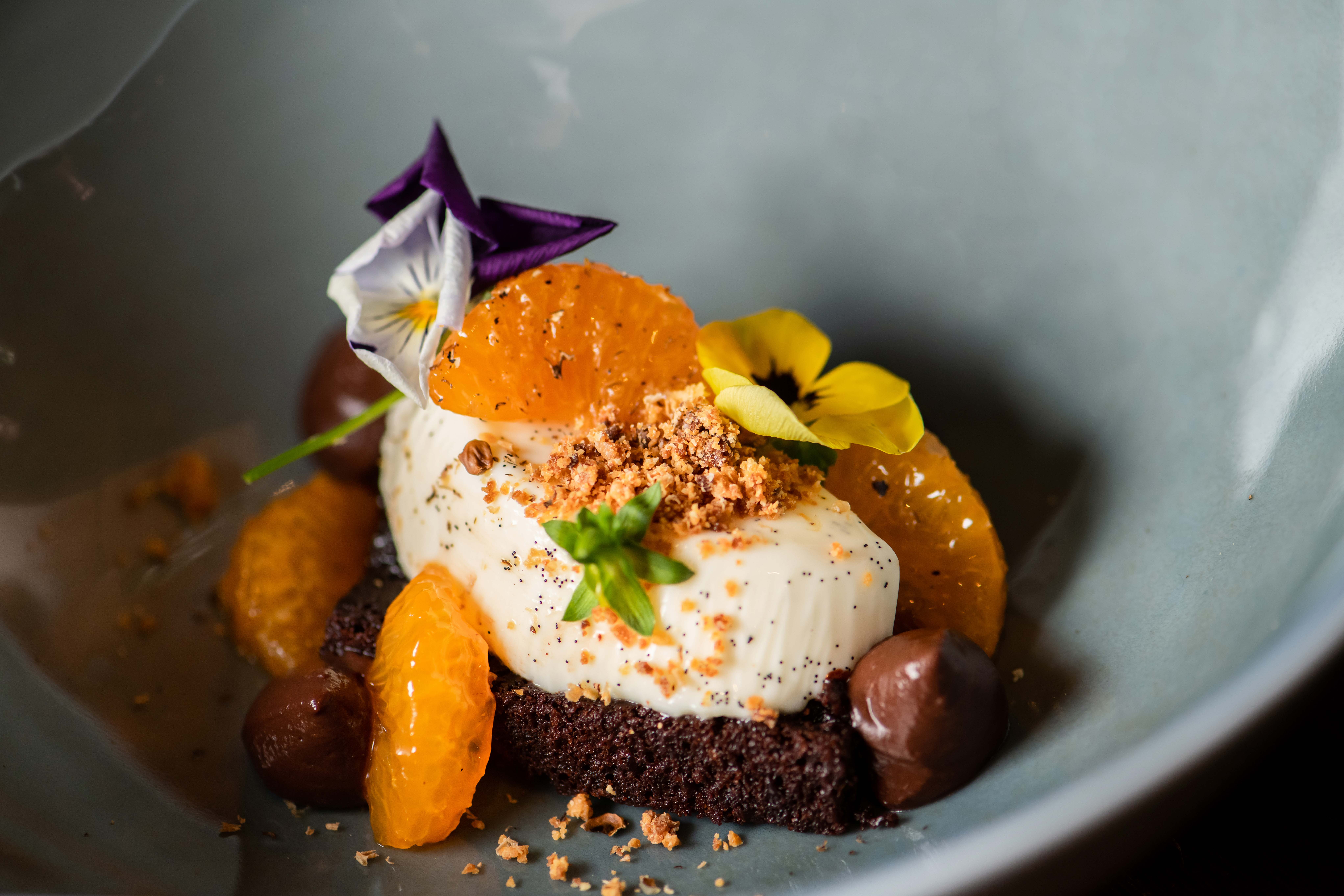 甜品是「The Islands島嶼群」,底部是黑朱古力蛋糕,帶有紅漿果味,而蛋糕表面是以雲呢拿草和福岡柑橘製成的意式奶凍,再撒上研磨的零陵香豆粉。