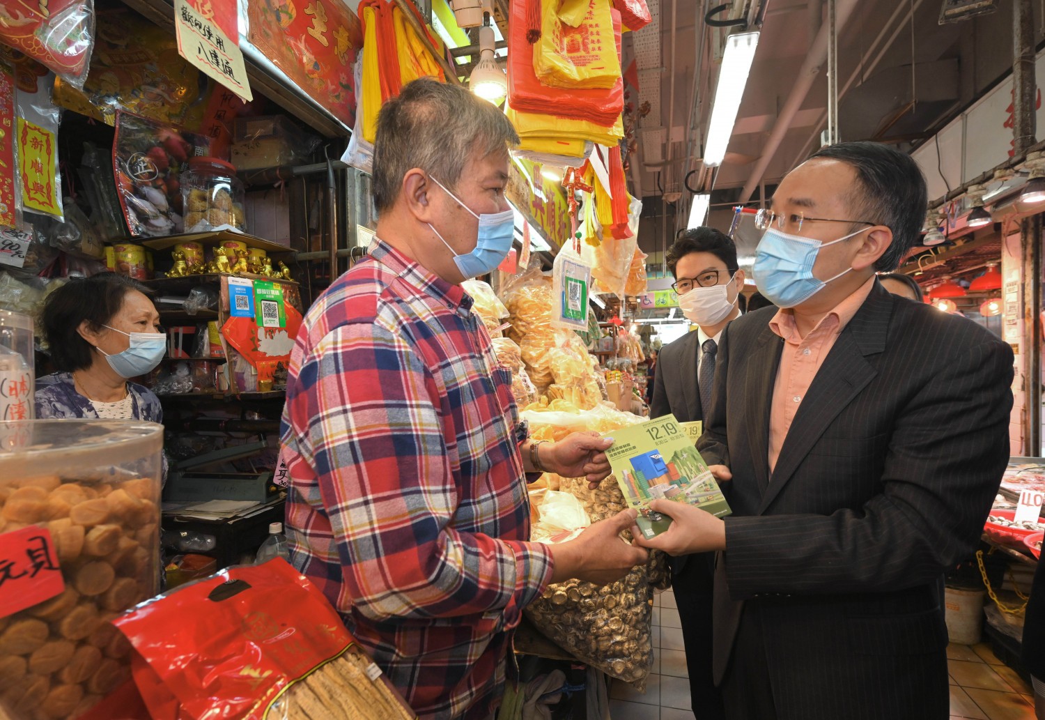 財經事務及庫務局局長許正宇今日到訪士美非路街市時向商戶派發傳單,呼籲於12月19日立法會換屆選舉投票日行使權利,踴躍投票。政府新聞處