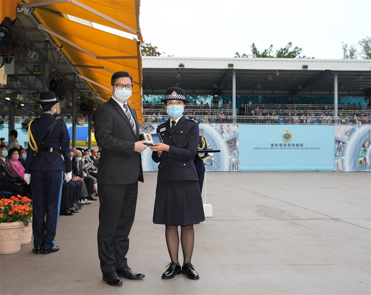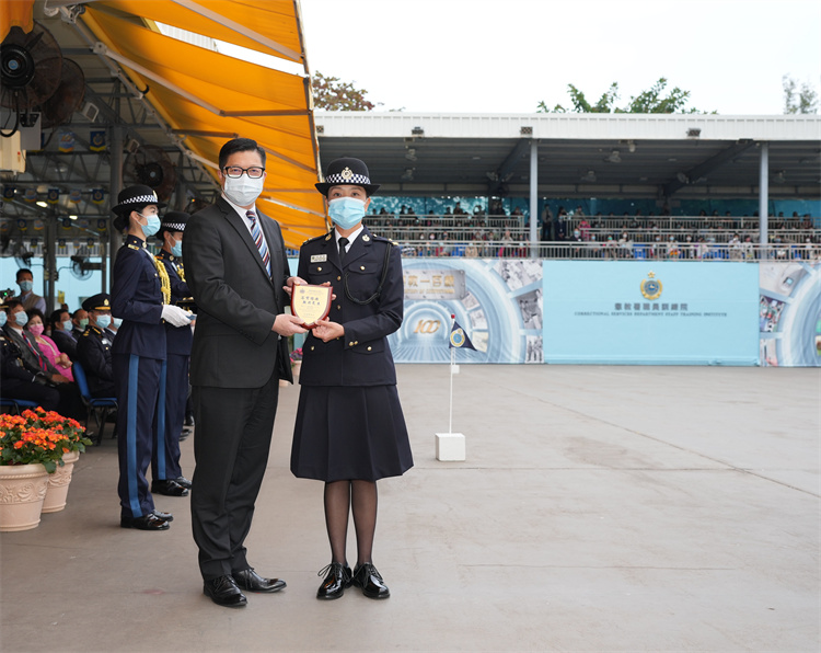保安局局長鄧炳強(左)頒發最優秀學員「院長盾」予懲教主任王雪茗。