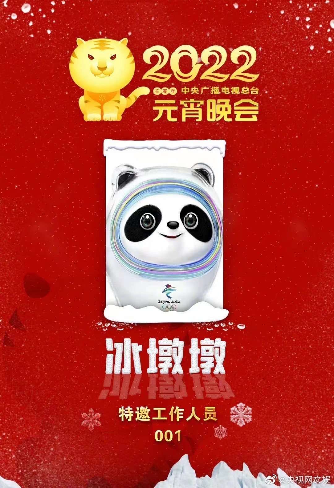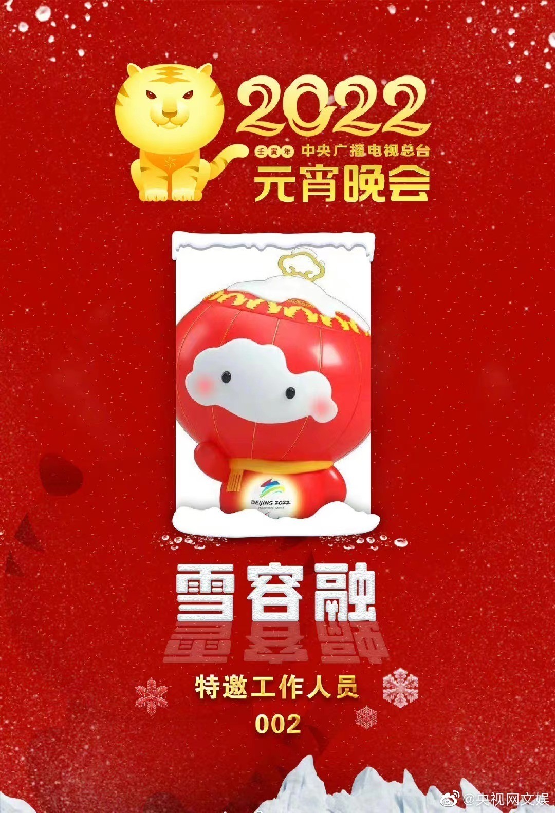 2月11日,中央廣播電視總台2022元宵晚會官宣冰墩墩、雪容融將要加盟,並發布編號分別為「001」「002」的「特邀工作人員」工作證,配文稱「證件照放不下冰墩墩、雪容融的小臉」。