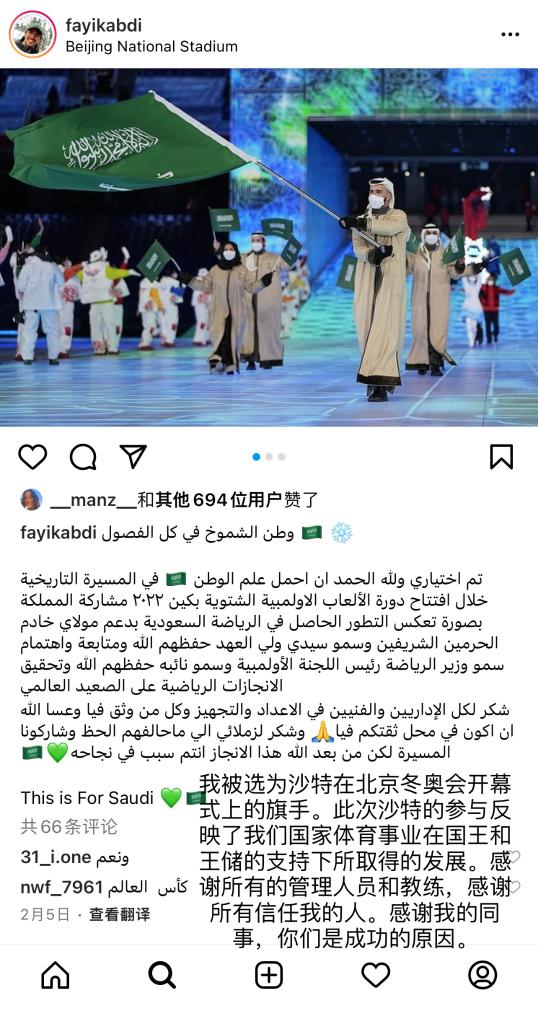 作為沙特代表團唯一的參賽運動員,法伊克·阿卜迪在北京冬奧會開幕式上高舉沙特國旗步入會場。這也是沙特這個大部分國土被沙漠覆蓋的國家史上首次參加冬奧會。