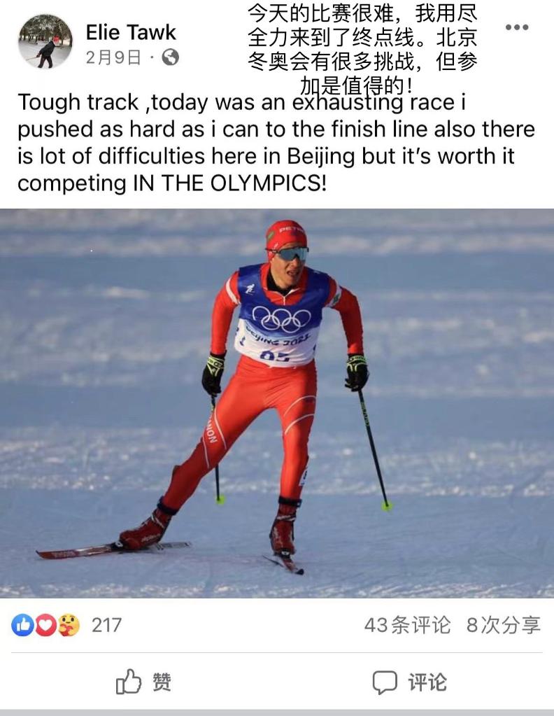 滑雪小將埃利·陶克在個人社交媒體上表示,參加冬奧會「就像夢一樣」,「雖然有很多挑戰,但也是值得的」。