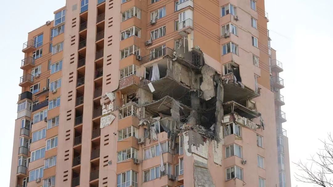 俄羅斯向烏克蘭首都基輔發動的攻勢持續。基輔市長今天(26日)表示,市西南部近機場,有高層住宅大廈遭到導彈攻擊,暫時未有傷亡報告。相片可見,大樓穿了一個大洞。