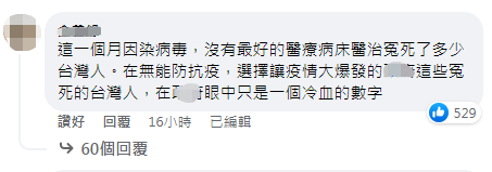 帖文遭大批網友留言,認為疫情嚴重威脅甚至已帶走嬰幼兒生命,此時才喊要提升量能實在太晚,更有人嗆:「還是只會去綠色的城市,其他人的命不是命?」