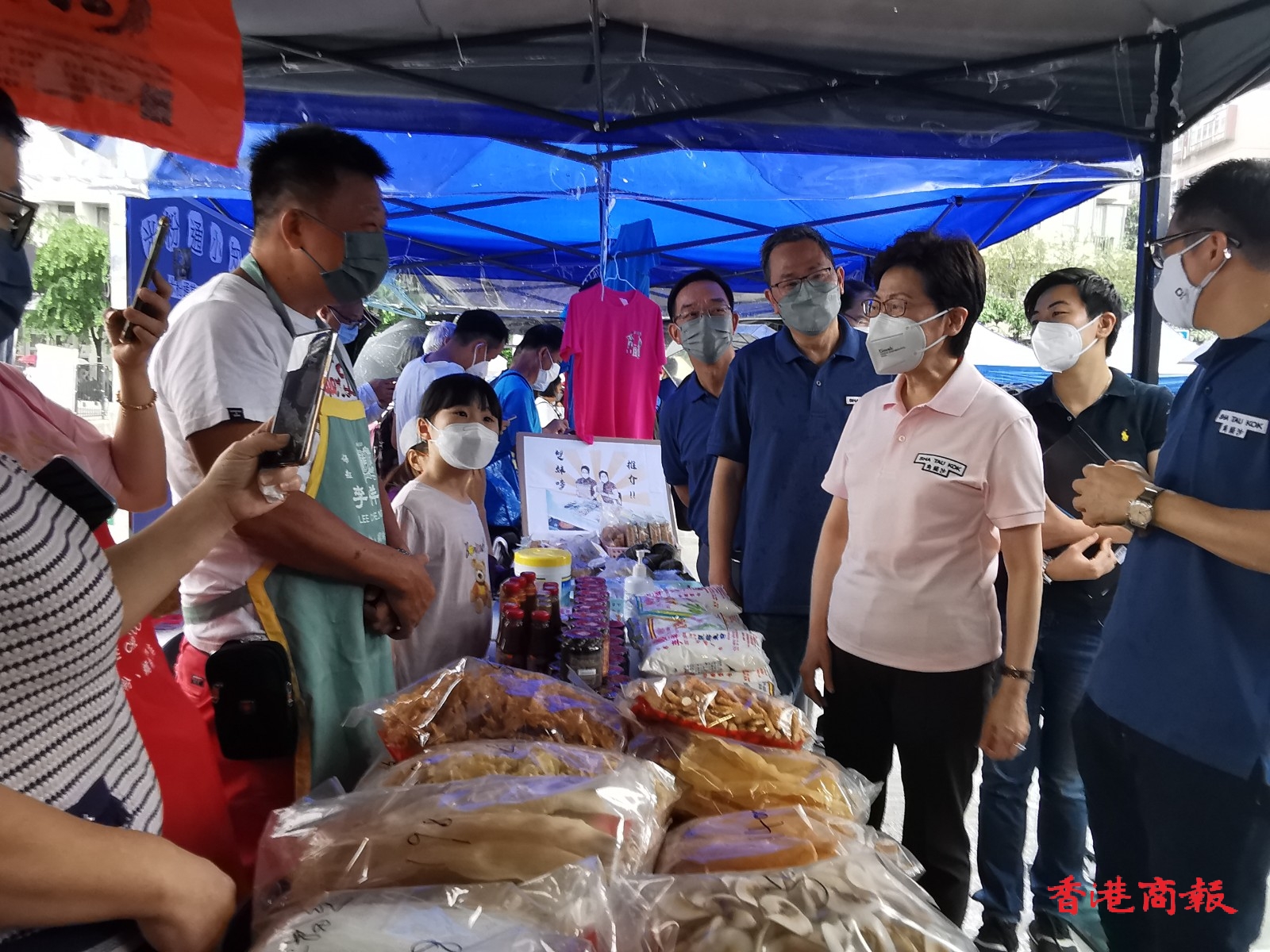 儀式過後,林鄭一行參觀了介紹沙頭角發展的展板及售賣富沙頭角特色紀念品和風味小食的攤位,並聽取鄧炳強講解試驗計劃的實施安排和新建設施。
