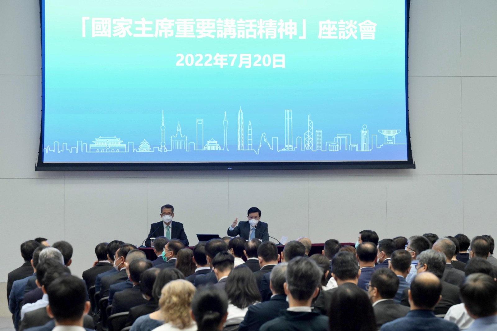 國家主席習近平於「慶祝香港回歸祖國二十五周年大會暨香港特別行政區第六屆政府就職典禮」上發表重要講話。公務員事務局就此舉辦一連串「國家主席重要講話精神」座談會,讓與會者深入了解國家主席重要講話的精神。第三場座談會今日(20日)在政府總部舉行,由行政長官李家超主講。他表示,希望特區政府領導官員及公務員認真研讀及領會習主席重要講話內容,把握核心要義,聯繫自身工作,以此作為施政的大方向和大藍圖,提升治理水平,增加發展動能,紓解民困,凝聚社會力量,共同建立和諧、包容、多元社會,並且自覺尊重和維護國家的根本制度。