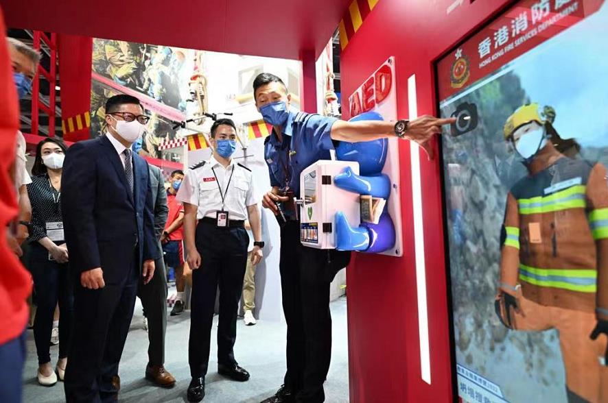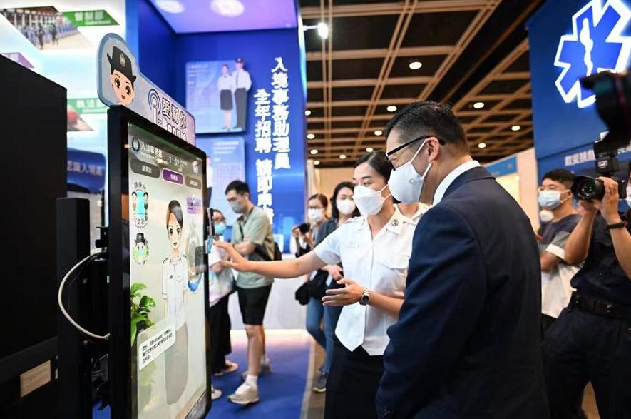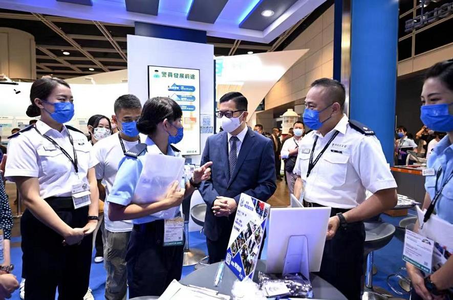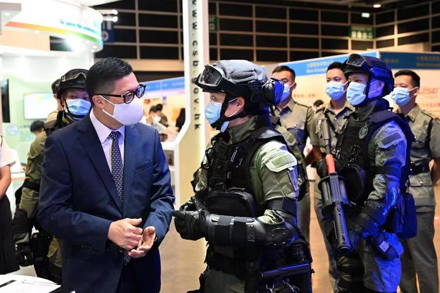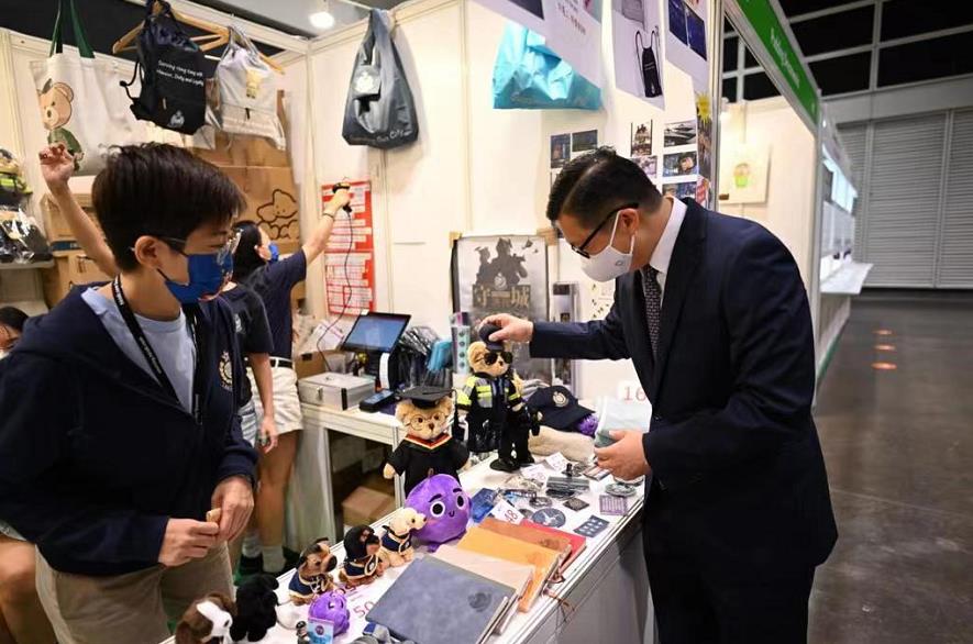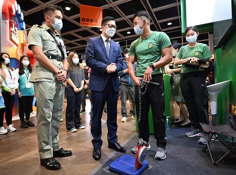 鄧炳強又到訪紀律部隊(包括警務處、入境處、海關、懲教署和消防處)設於教育及職業博覽的攤位,了解紀律部隊的招募情況並為同事打氣。
