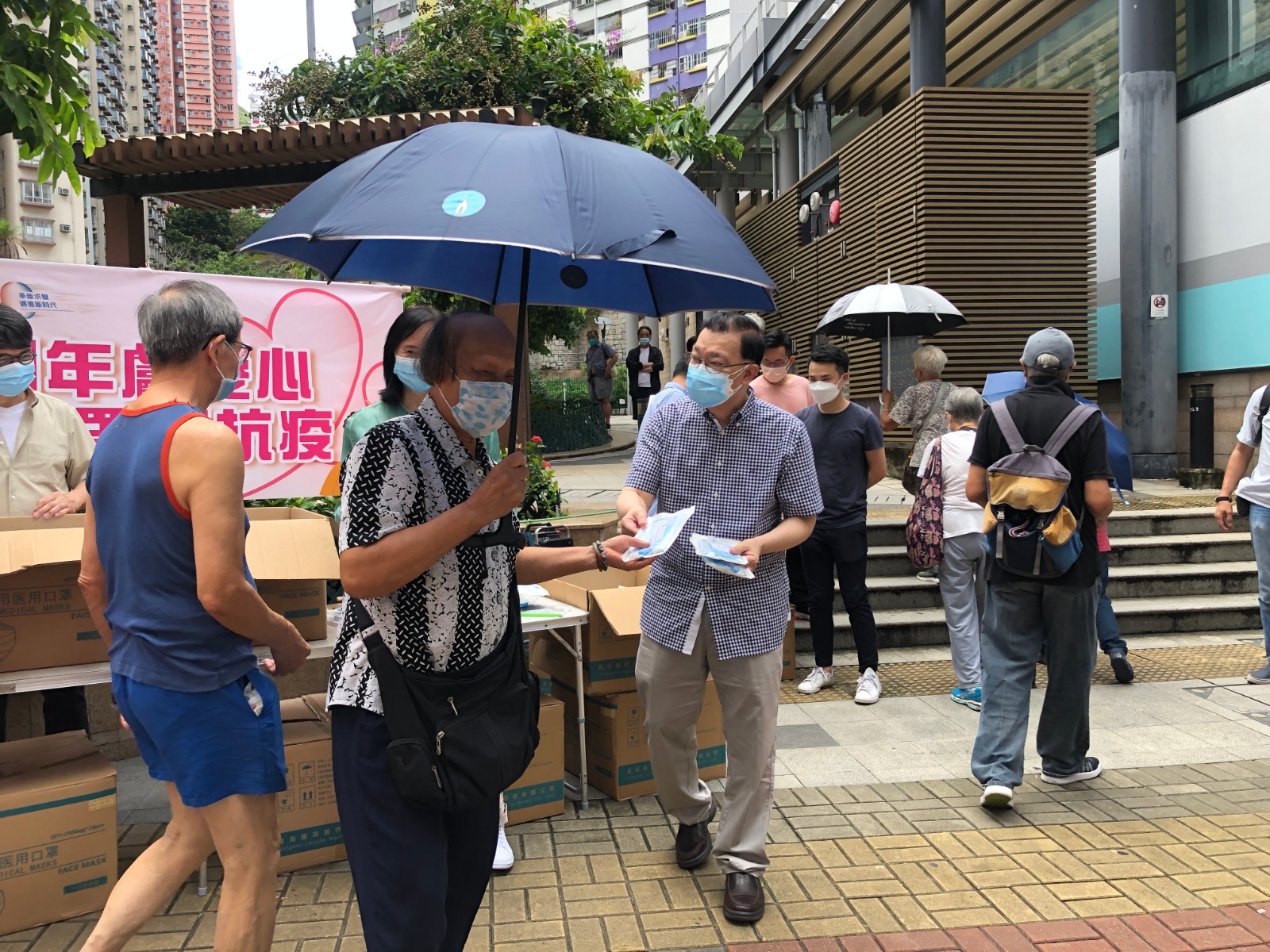 民建聯副主席陳學鋒表示,今日在全港開設逾250個服務街站,向市民派發一套十個裝的醫用級口罩,呼籲市民齊心抗疫,以及宣傳政府已擴展至讓6個月大至3歲嬰幼兒接種疫苗等信息。(記者 馮煒強)