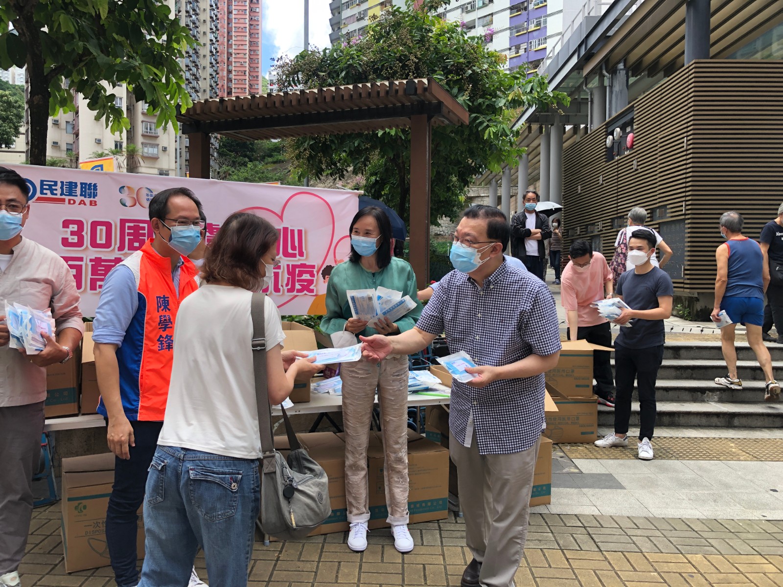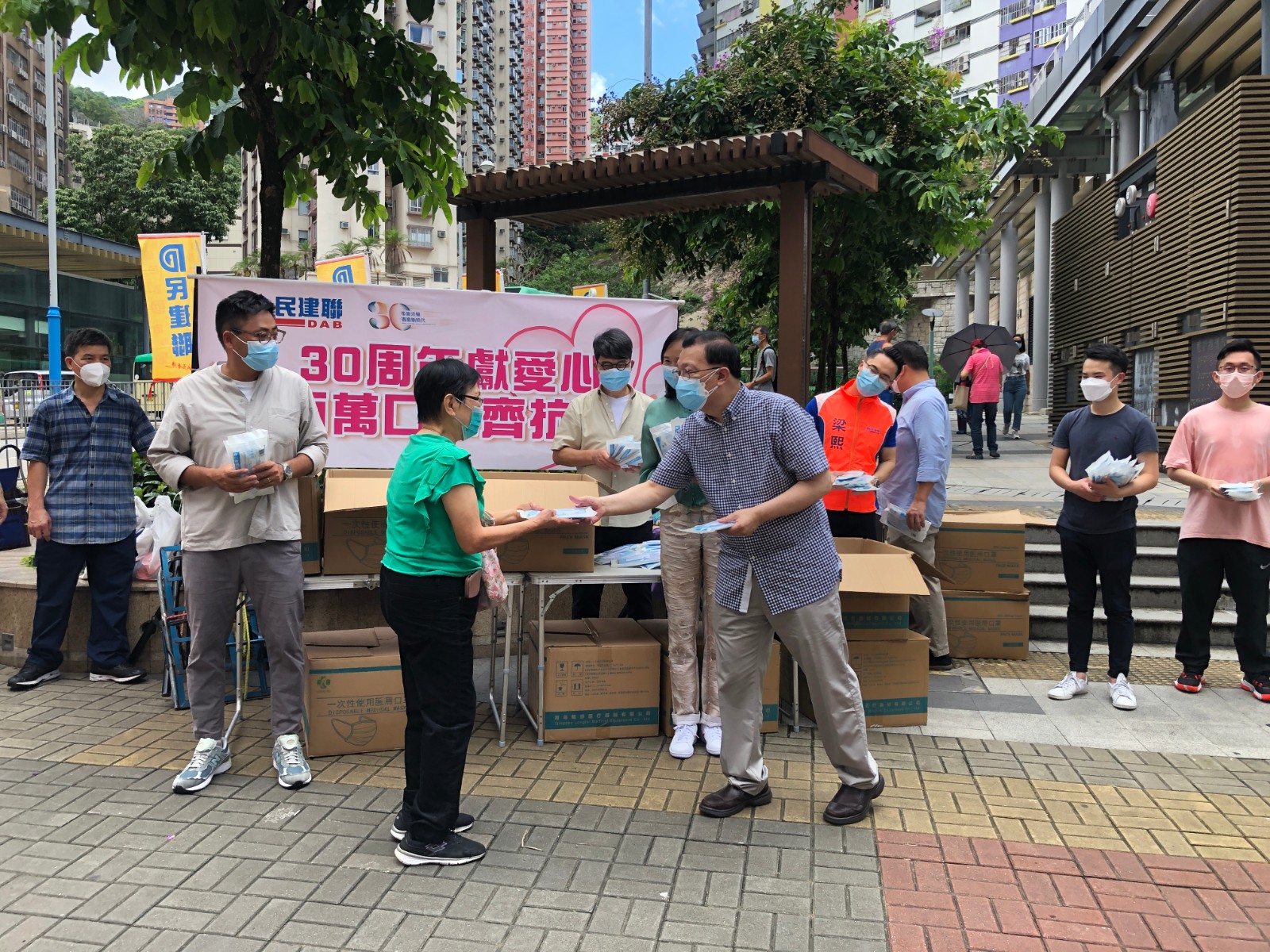 民建聯今日(7日)在堅尼地城舉行「三十周年獻愛心 百萬口罩齊抗疫」啟動儀式,並在全港開設逾250個服務街站,向市民派發一套十個裝的醫用級口罩,呼籲市民齊心抗疫。