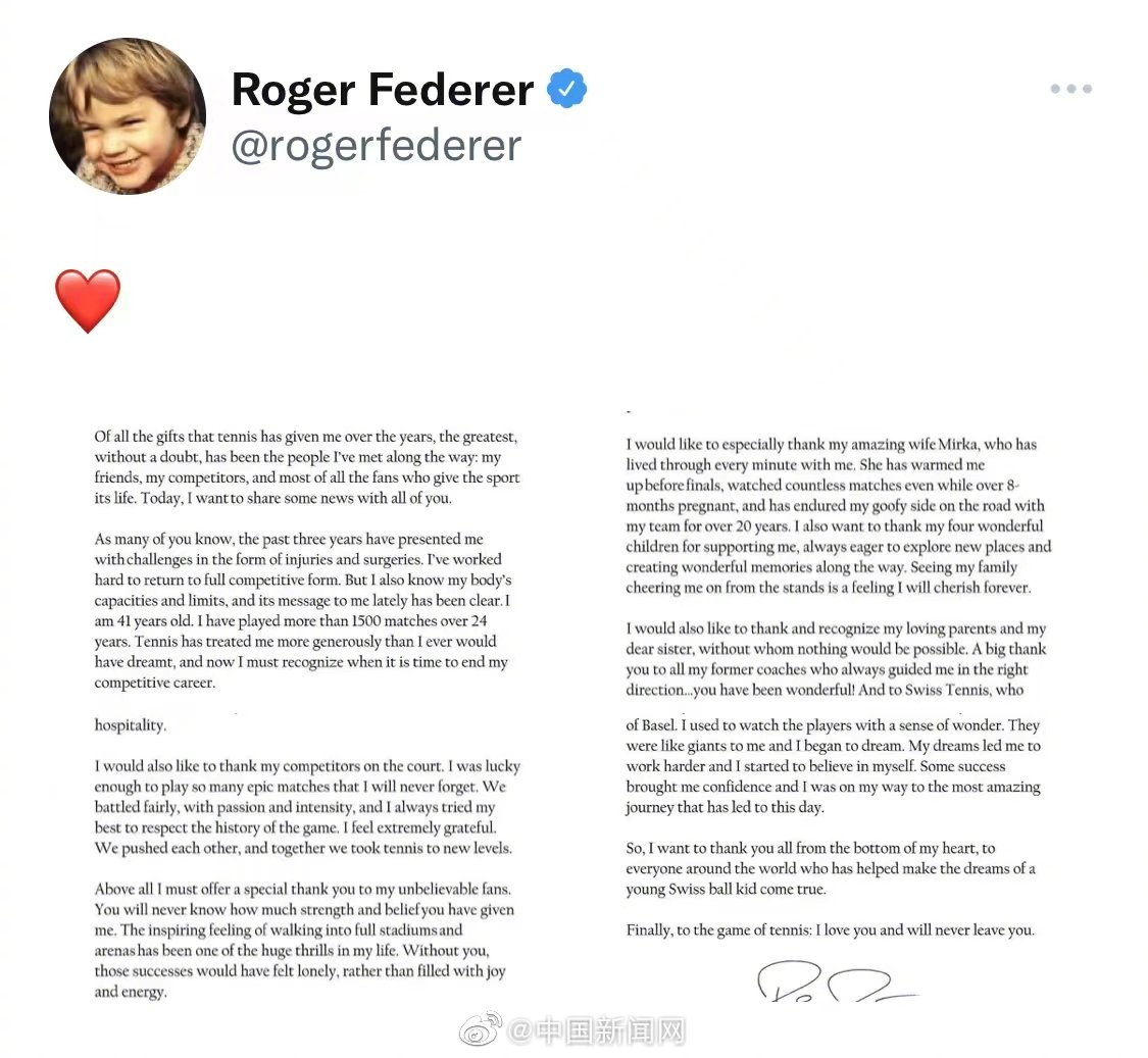 本港時間9月15日晚,現年41歲的瑞士網球天王費達拿(Roger Federer)在社交媒體上宣布即將退役,費達拿擁有20座大滿貫冠軍,職業生涯長達24年,但近幾年備受傷病困擾。