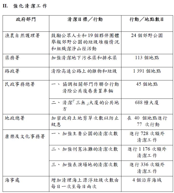 在過去一個月,在各部門同心協力積極配合下,打擊衞生黑點工作進展大致良好。各部門總共於全港超過460個衞生黑點進行清潔行動,於45個公共後巷進行聯合行動,以清理棄置車輛。