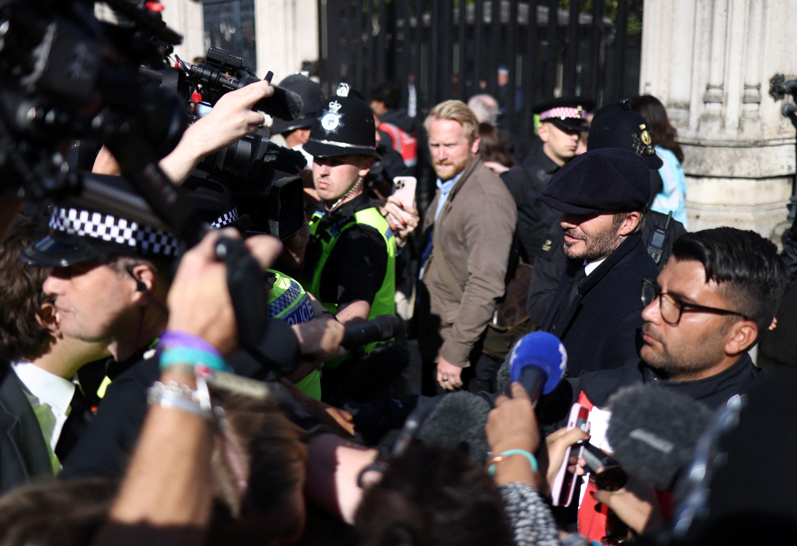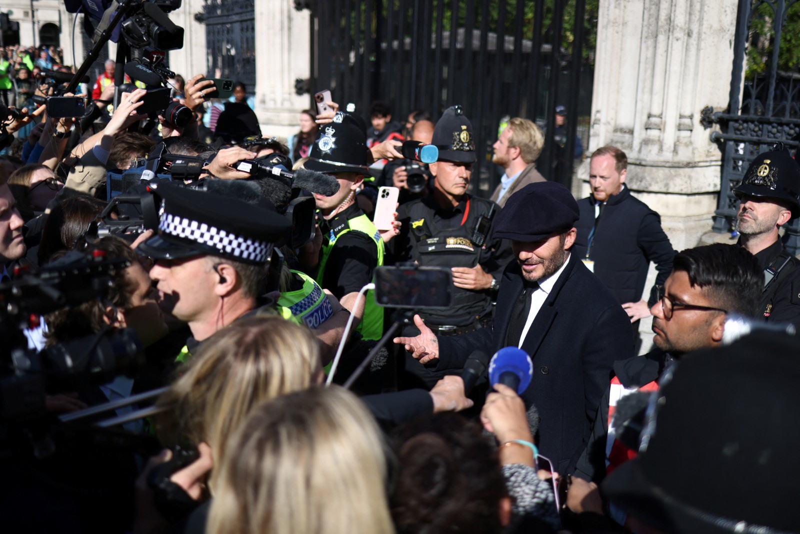 英女王伊利沙伯二世靈柩目前在倫敦西敏廳供人瞻仰悼念,前英格蘭國家足球隊隊長碧咸今天(16日)被發現也出現在排隊人龍中,頭戴貝雷帽、身穿黑色西裝低調現身。