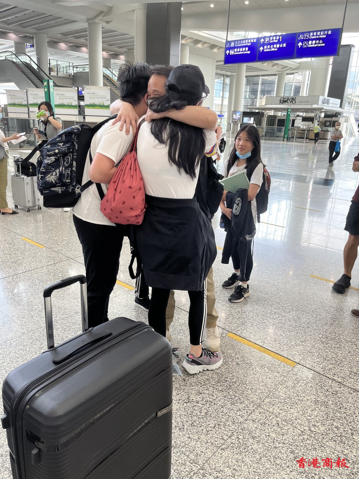 昨日為「0+3」實施翌日,香港國際機場人流雖不多,但溫馨場面頗多。早上,機場南面離境大堂有不少家庭在場送別親友,各人互相擁抱、合照,並相隔閘口揮手道別,有小女孩更一度落淚;至於抵港大堂,亦有市民等候家人回港,當中有年輕人飛奔與父親擁抱團聚,喜極而泣。返港旅客都先生就指,入境過程頗順利,他贊同本港最新的入境檢疫措施。