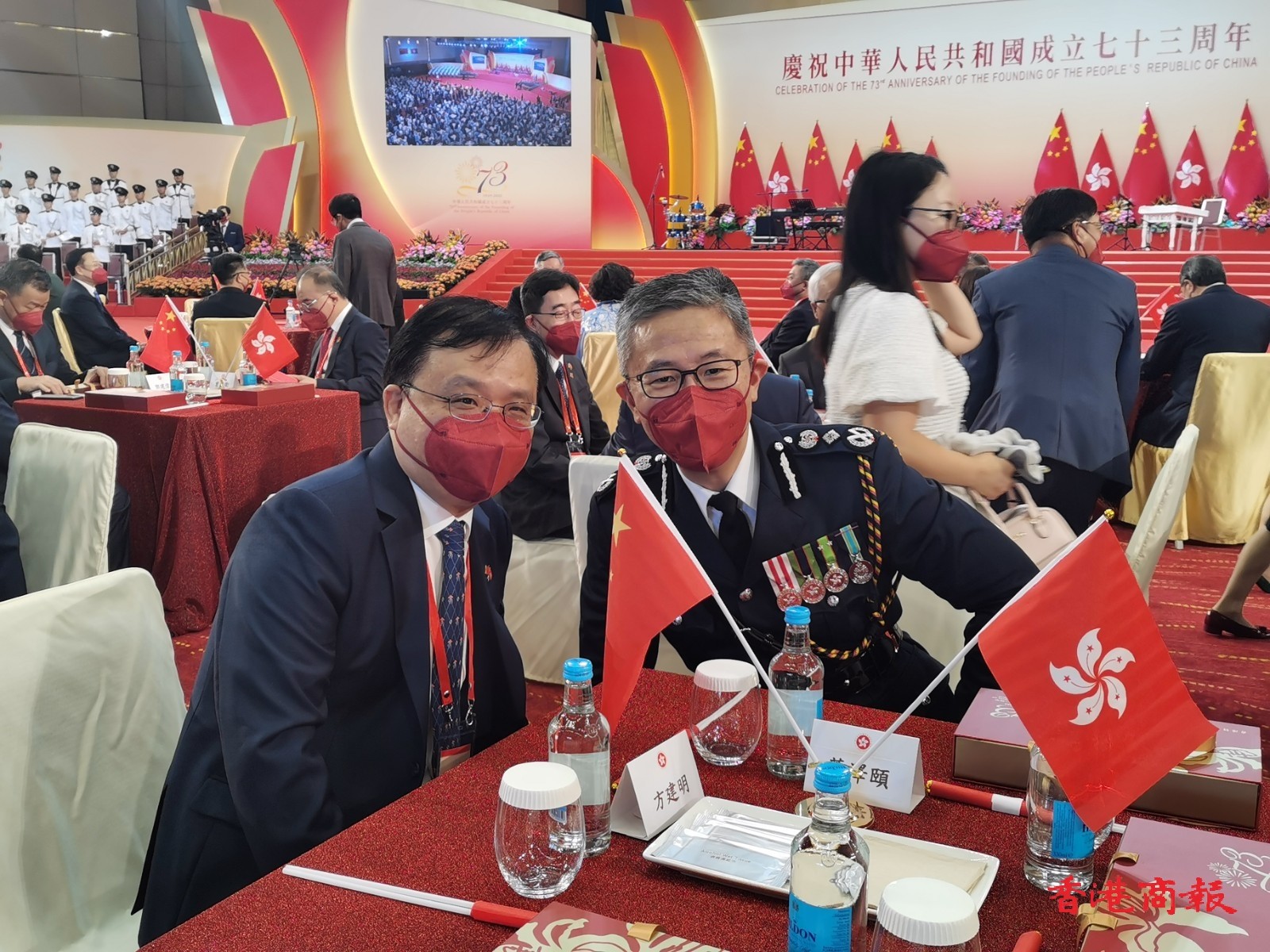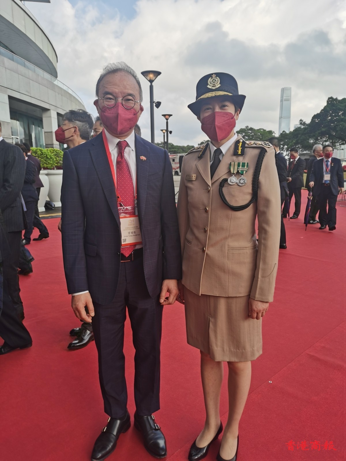 警務處處長蕭澤頤拍完照也匆匆離去,他說還要入元朗,去一個中學參加活動,雖然時間有點趕,但看到蕭SIR臉上的笑容還是很輕鬆的,回想起2019和2020年的國慶,那有可能參加國慶活動,社會那麼亂,都要到前綫支援和指揮。現在社會回復穩定,蕭SIR才能安心參加慶祝活動,忙得也安心。