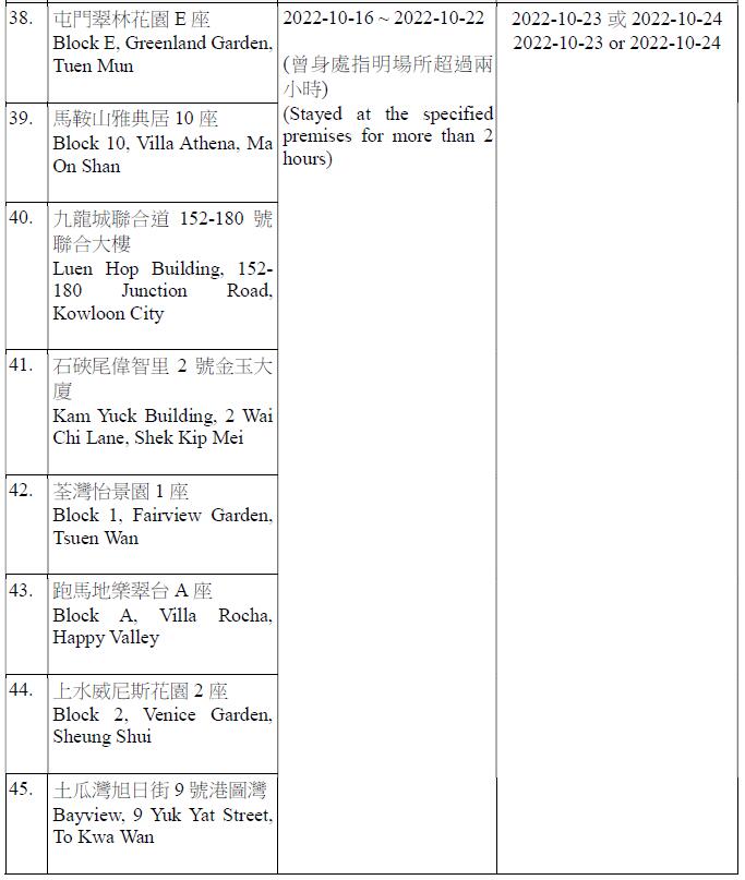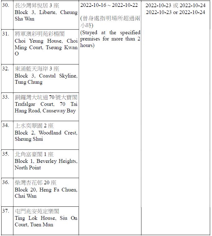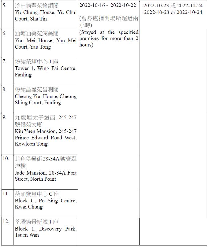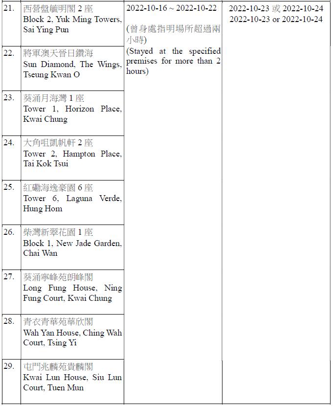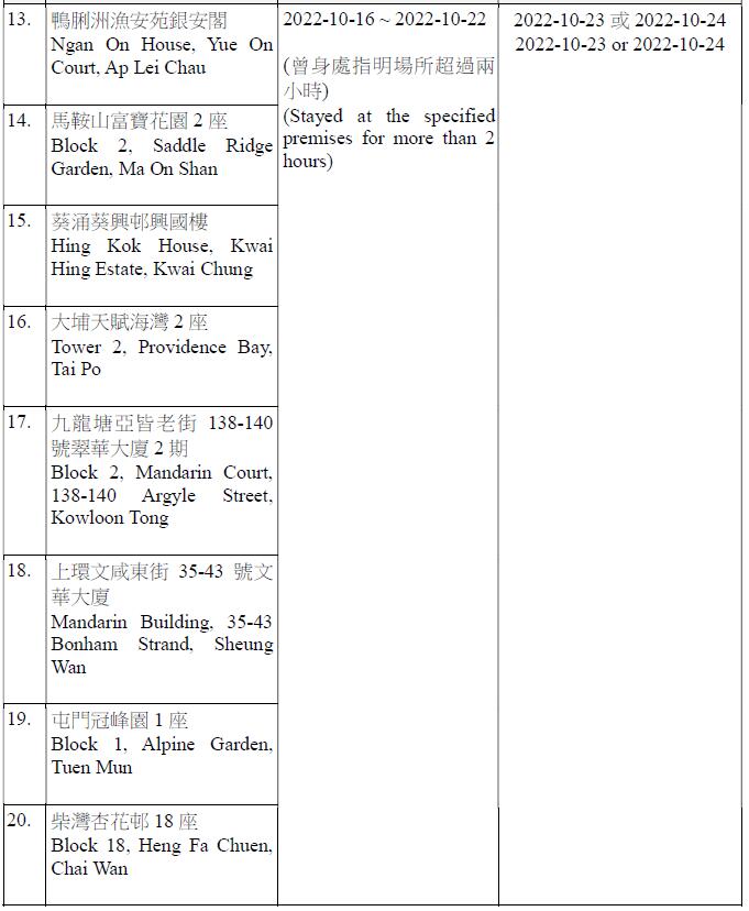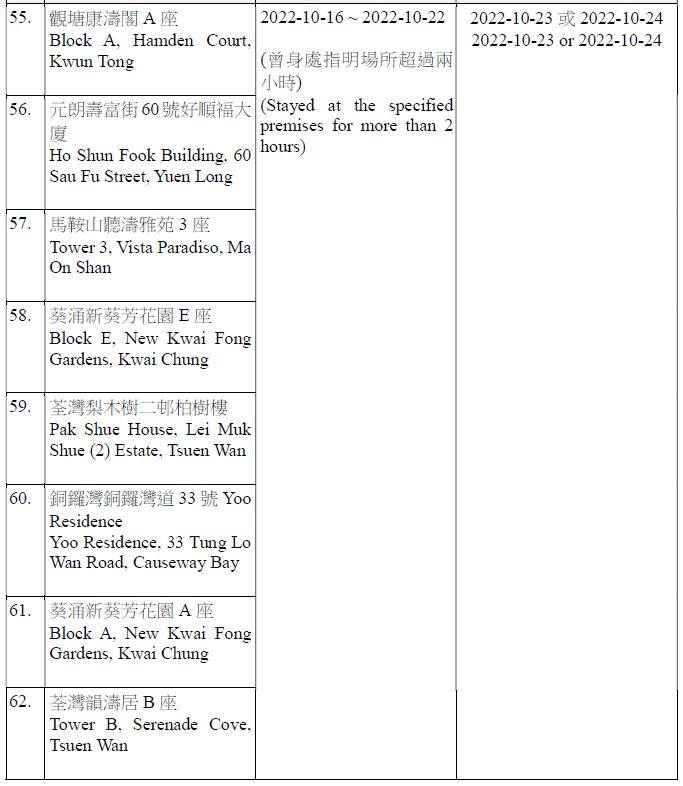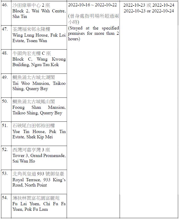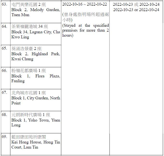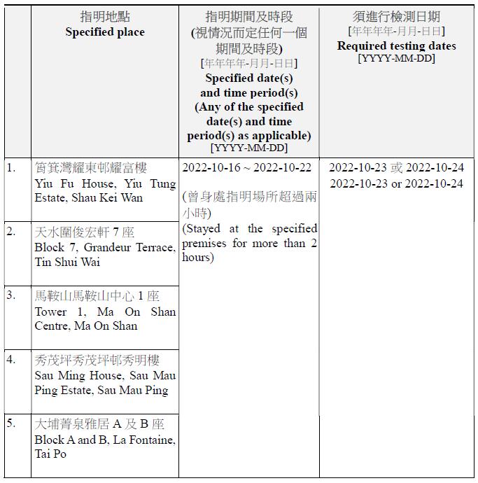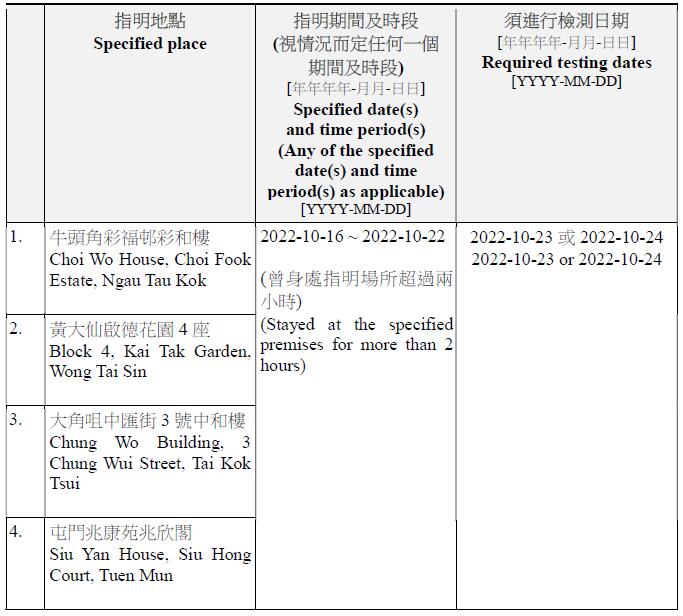 因應多宗陽性檢測個案,及採集到檢測呈陽性的污水樣本,港府今晚(22日)就強制檢測公告,要求於指定期間曾身處74個指明地方的人士,須在10月23日或10月24日接受核酸檢測,包括牛頭角彩福邨彩和樓、黃大仙啟德花園4座、大角咀中匯街3號中和樓、屯門兆康苑兆欣閣、沙田愉翠苑愉頌閣、油塘油美苑潤美閣、粉嶺榮輝中心1座、粉嶺昌盛苑昌潤閣、九龍塘太子道西245-247號僑苑大廈、北角堡壘街28-34A號寶翠洋樓等。