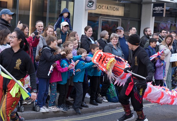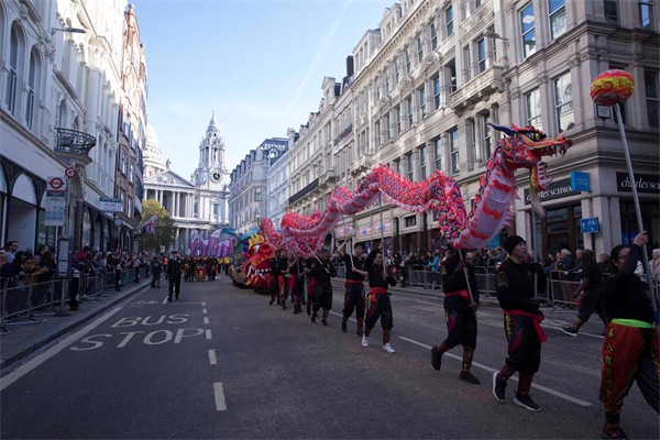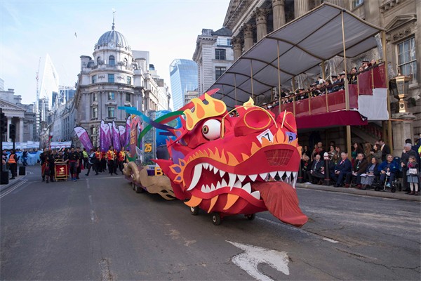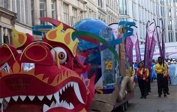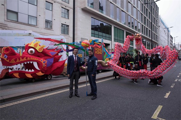 一眾舞龍師傅率領倫敦經貿辦的花車穿梭倫敦市中心。花車以龍身為主體,附以不同的香港特色地標,展現香港作為國際金融中心的獨特地位及蓬勃發展。另外,25名持旗手伴隨花車前行,以紀念香港特別行政區成立25周年。