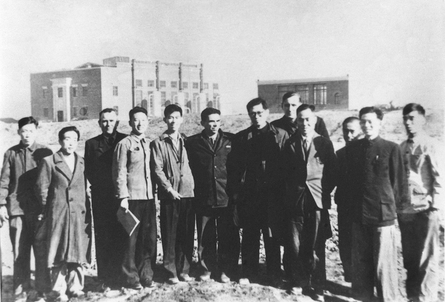 1956年,江澤民同志(左七)在長春第一汽車製造廠同援建一汽的蘇聯專家等合影。
