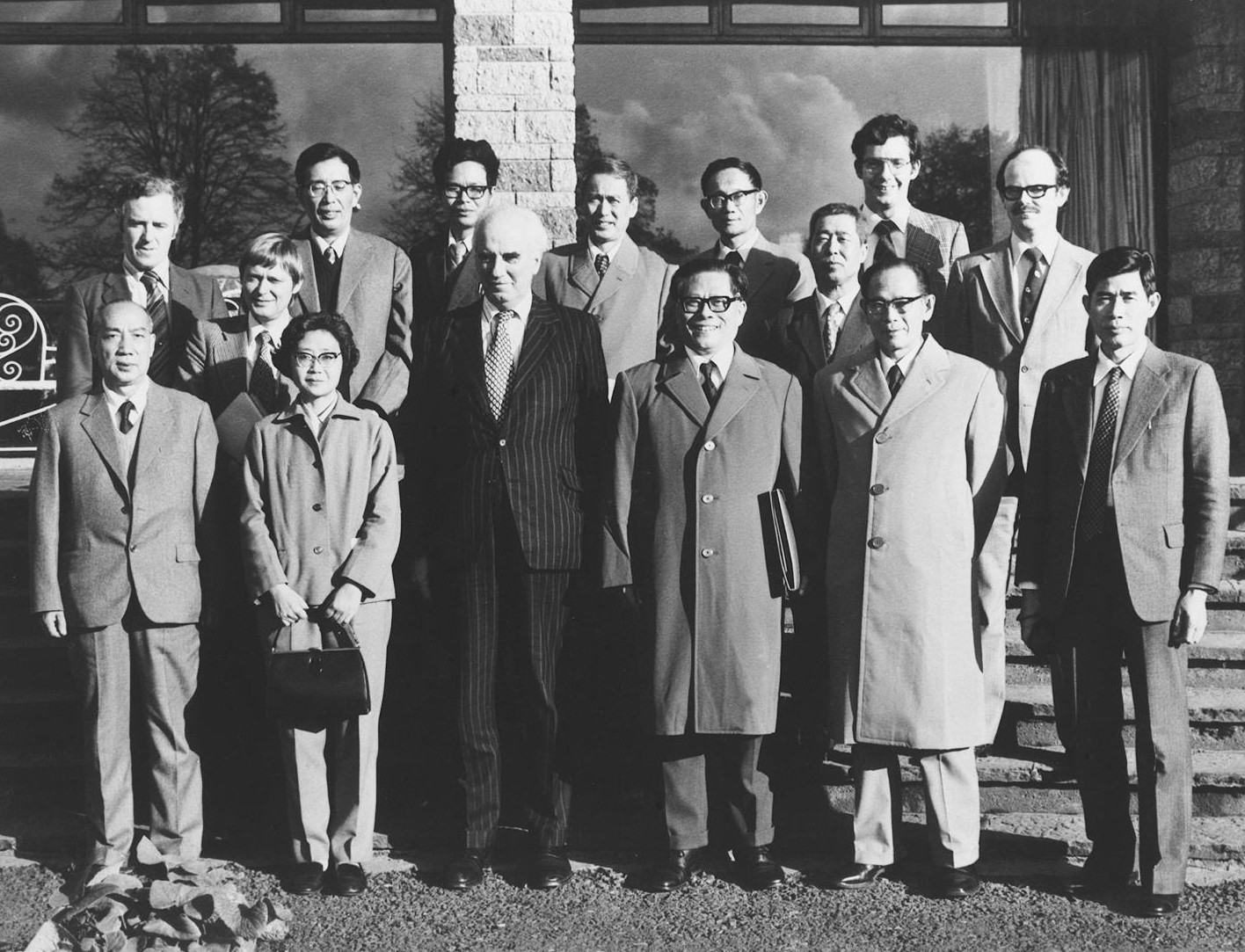 1964年6月,江澤民同志(二排右一)在法國艾克斯萊班出席國際電工委員會會議期間同與會代表合影。