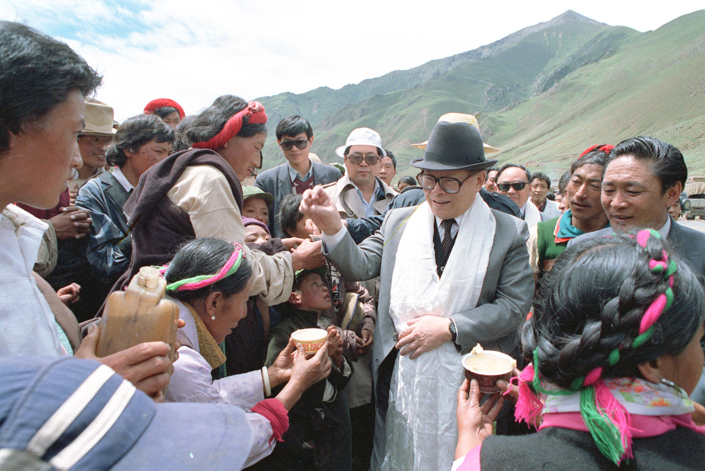1990年7月25日,江澤民同志與藏族群眾共慶望果節。