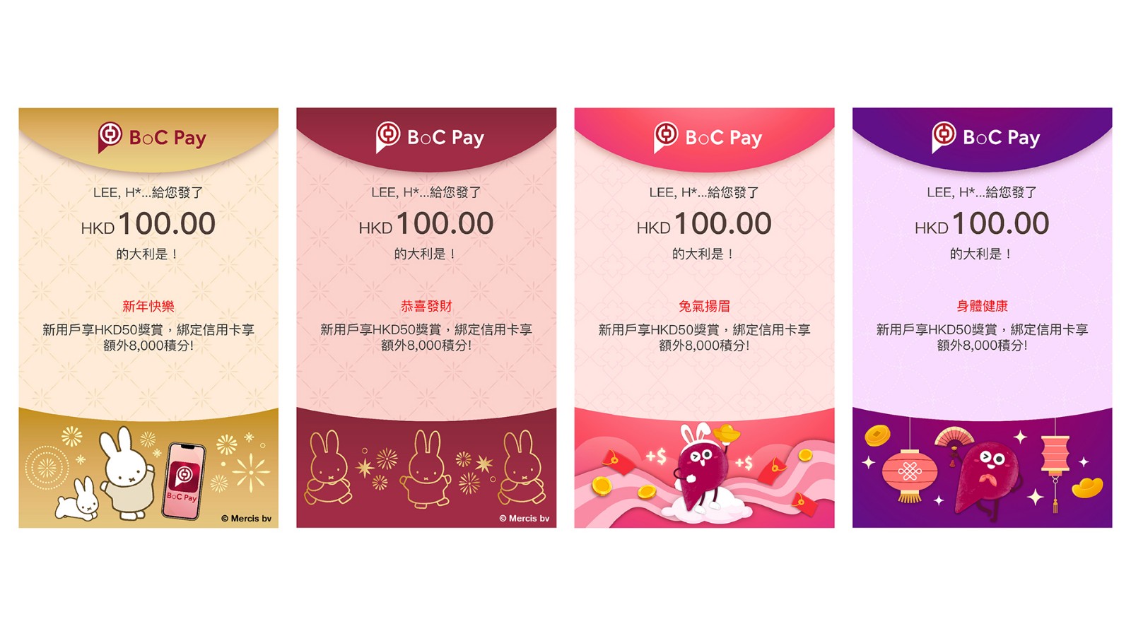 此外,客戶使用BoC Pay派發電子利是,將額外獲贈高達8000積分獎賞,BoC Pay新用戶享50元迎新獎賞及綁定中銀銀聯雙幣信用卡享額外8000積分獎賞。客戶經BoC Pay或手機銀行派發或收取電子利是,均可於下月10日至28日的定期存款推廣期,專享7天港元特優定期存款年利率高達18%。此外,年滿11歲至17歲的中銀香港客戶成功登記轉數快後,可經手機銀行收取電子利是。