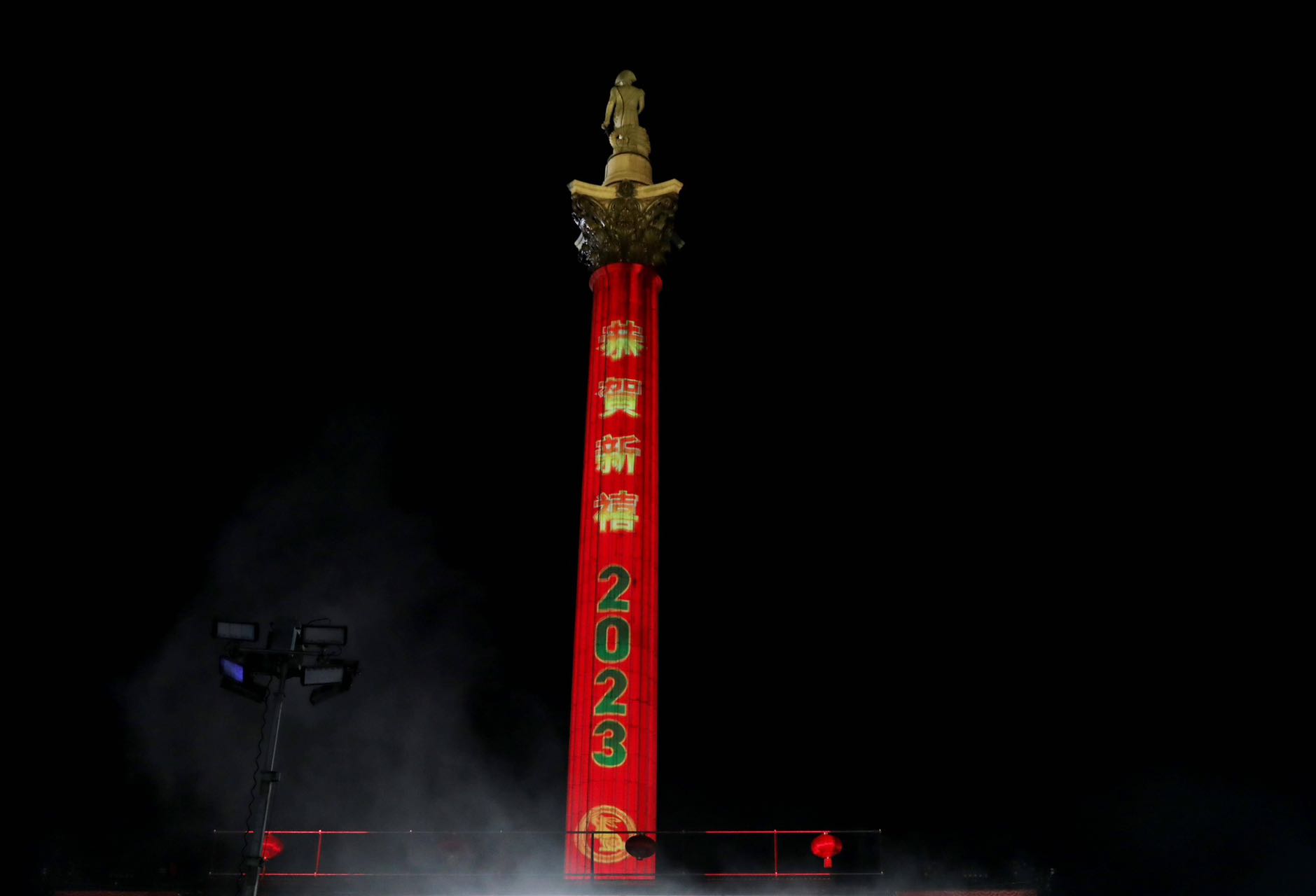 紅色的燈光裏,廣場上納爾遜紀念柱的柱身出現「恭賀新禧2023」中文字樣,洋溢喜慶的氣氛。