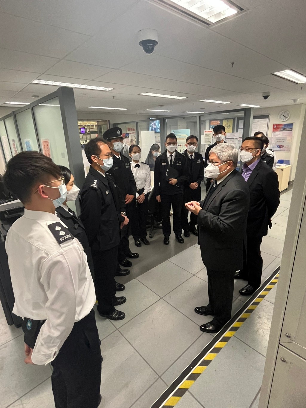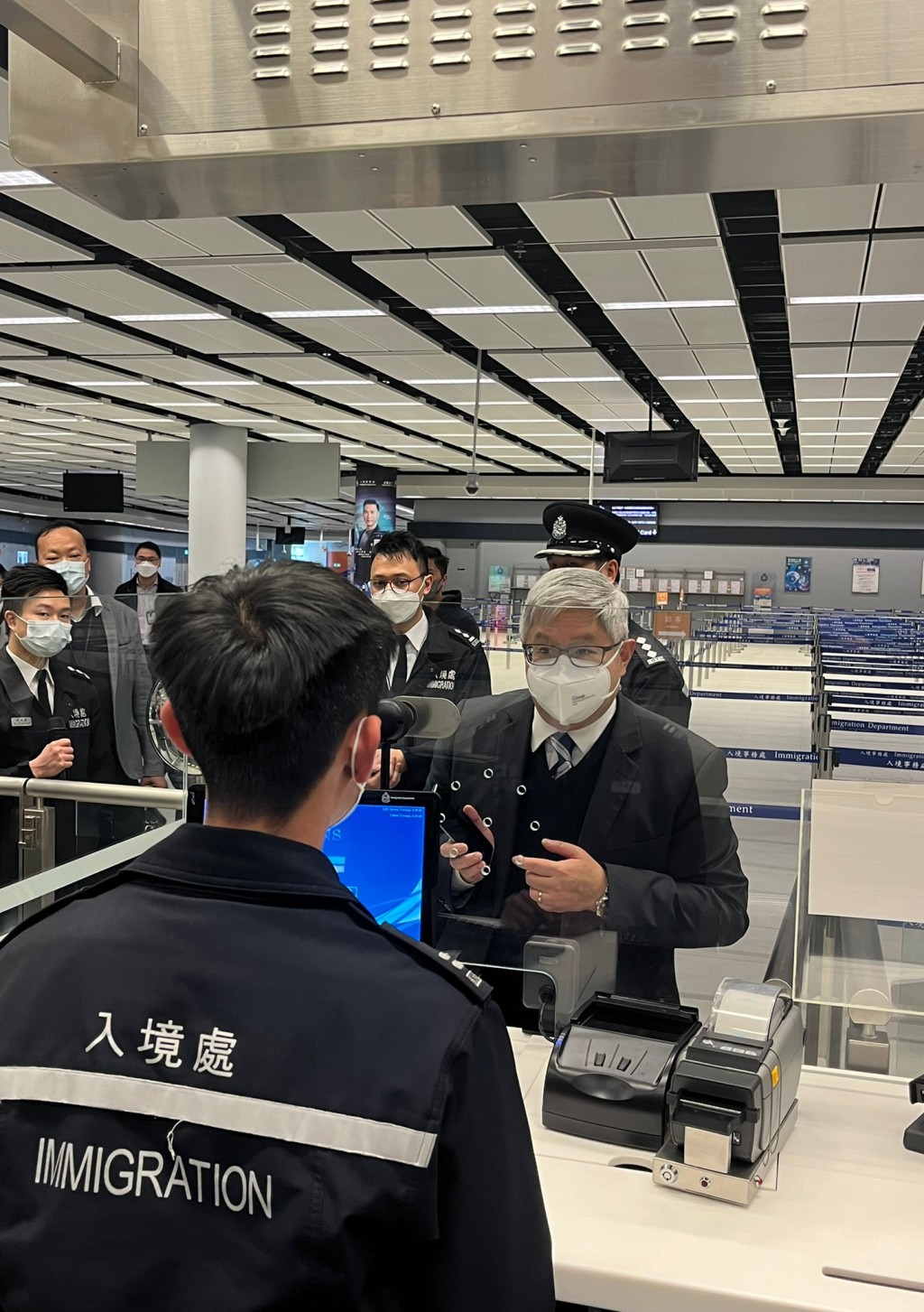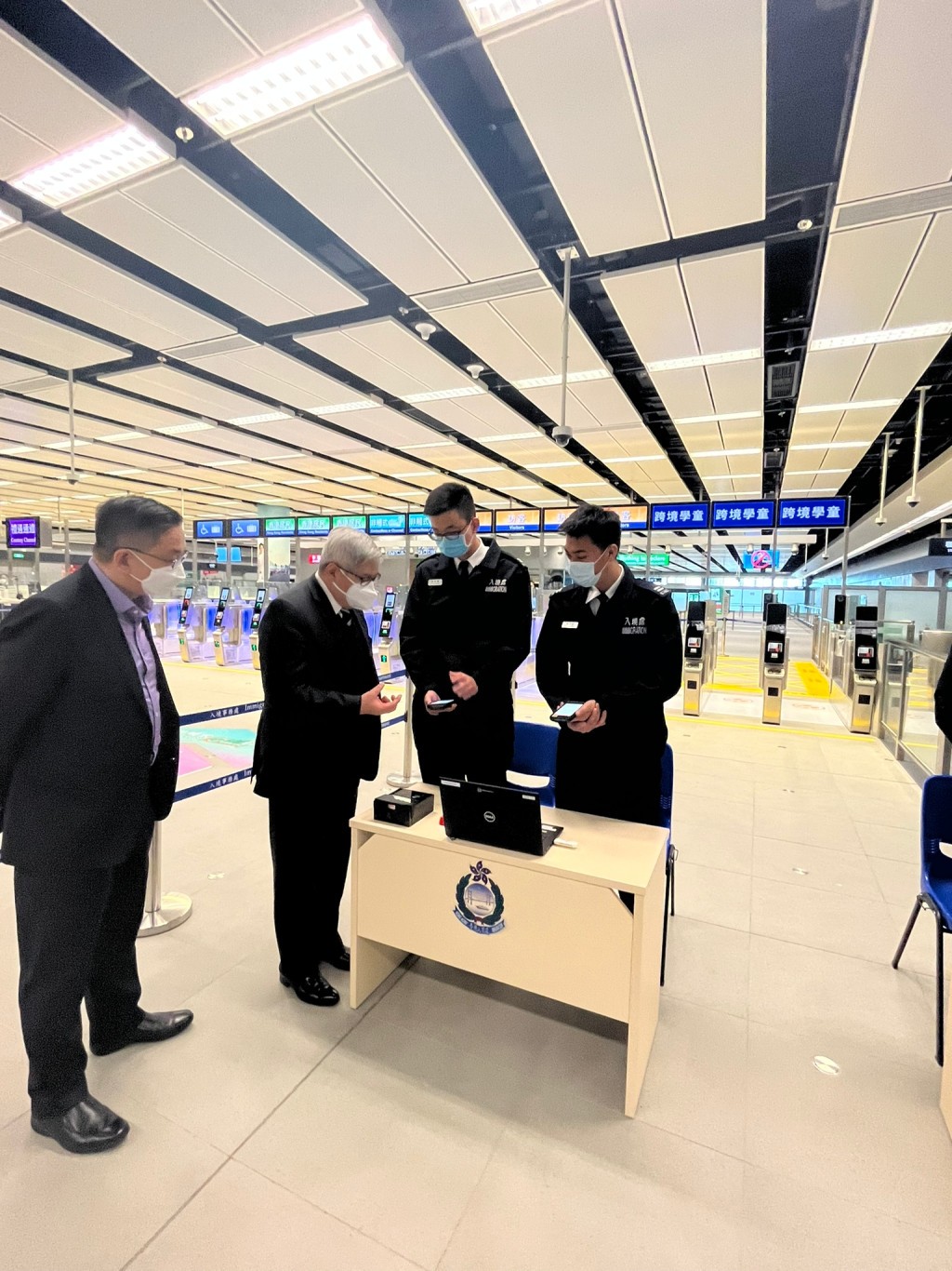 入境處處長區嘉宏及副處長郭俊峯今日到香園圍邊境管制站,視察客運設施開通的準備工作及新的非觸式e-道,勉勵入境處人員要齊心協力,為旅客提供最優質的出入境服務。