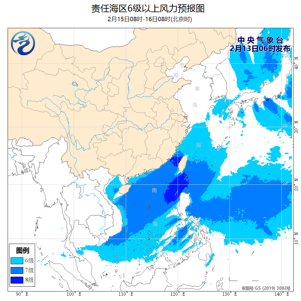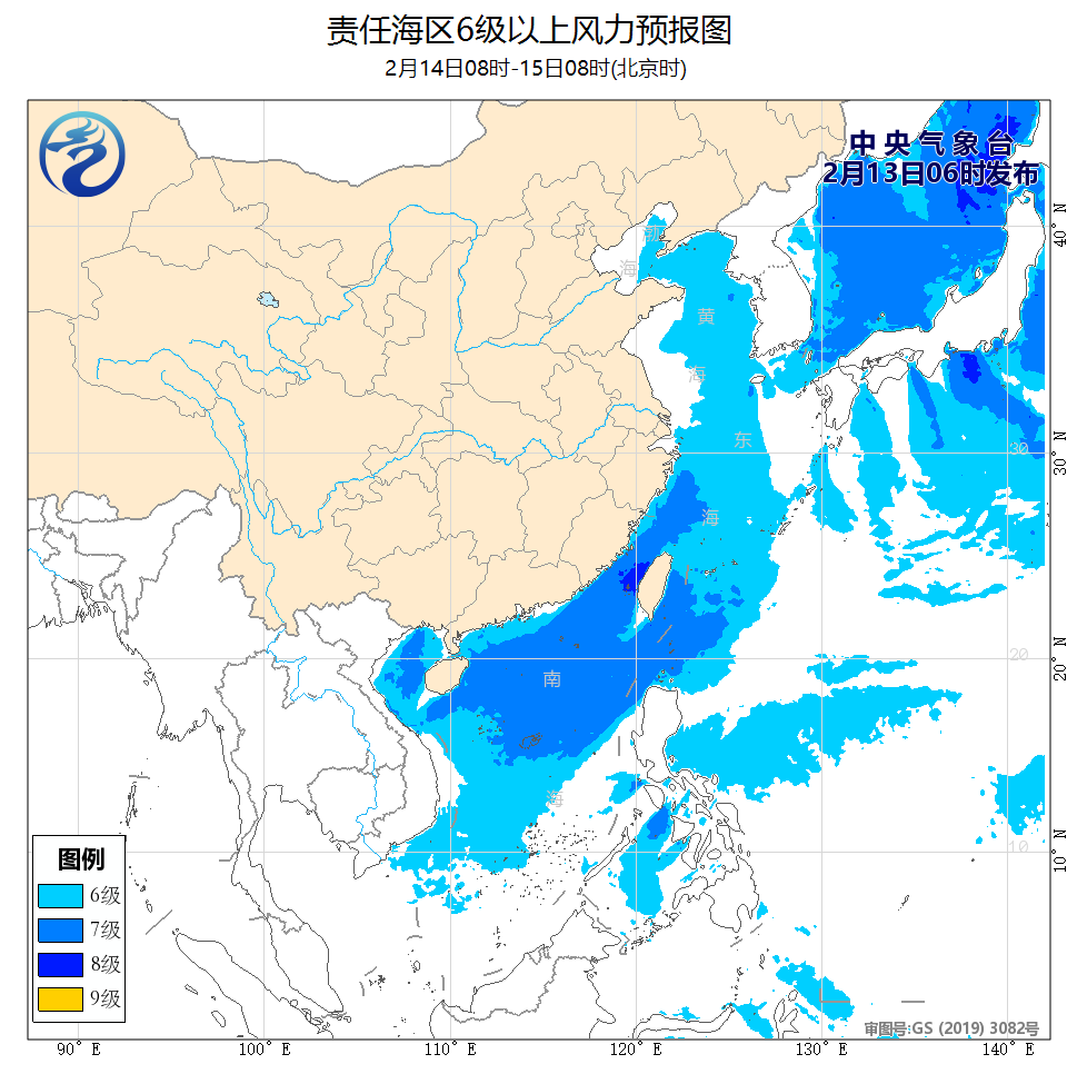 13日夜間至15日夜間,受冷空氣和入海氣旋的共同影響,渤海、渤海海峽、黃海大部海域、東海大部海域、台灣海峽、台灣以東洋面、巴士海峽、南海大部海域、北部灣將先後有6~7級、陣風8~9級的偏北風到東北風,其中東海東北部、台灣海峽、巴士海峽、南海東北部和中東部的部分海域風力可達8級、陣風9~10級。