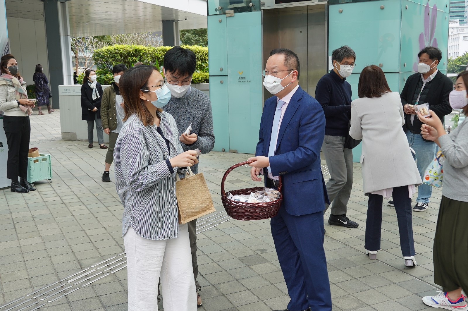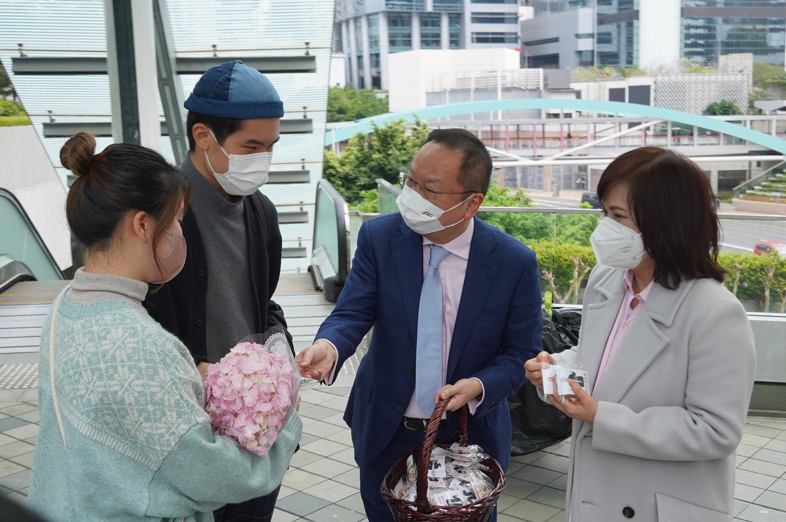 今日是情人節,民建聯立法會議員陳仲尼偕同太太區海倫中午在金鐘海富中心往添馬政府總部一段行人天橋,向市民派朱古力。