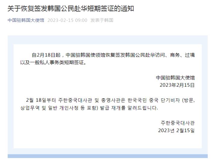 據中國駐韓國大使館微信公眾號消息,自2月18日起,中國駐韓國使領館恢復簽發韓國公民赴華訪問、商務、過境以及一般私人事務類短期簽證。