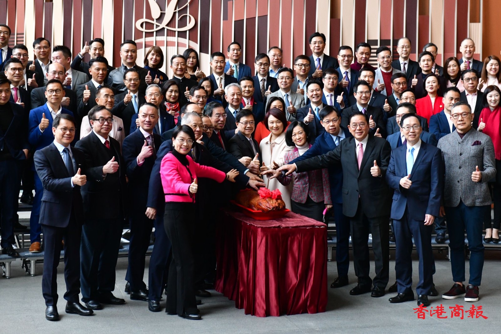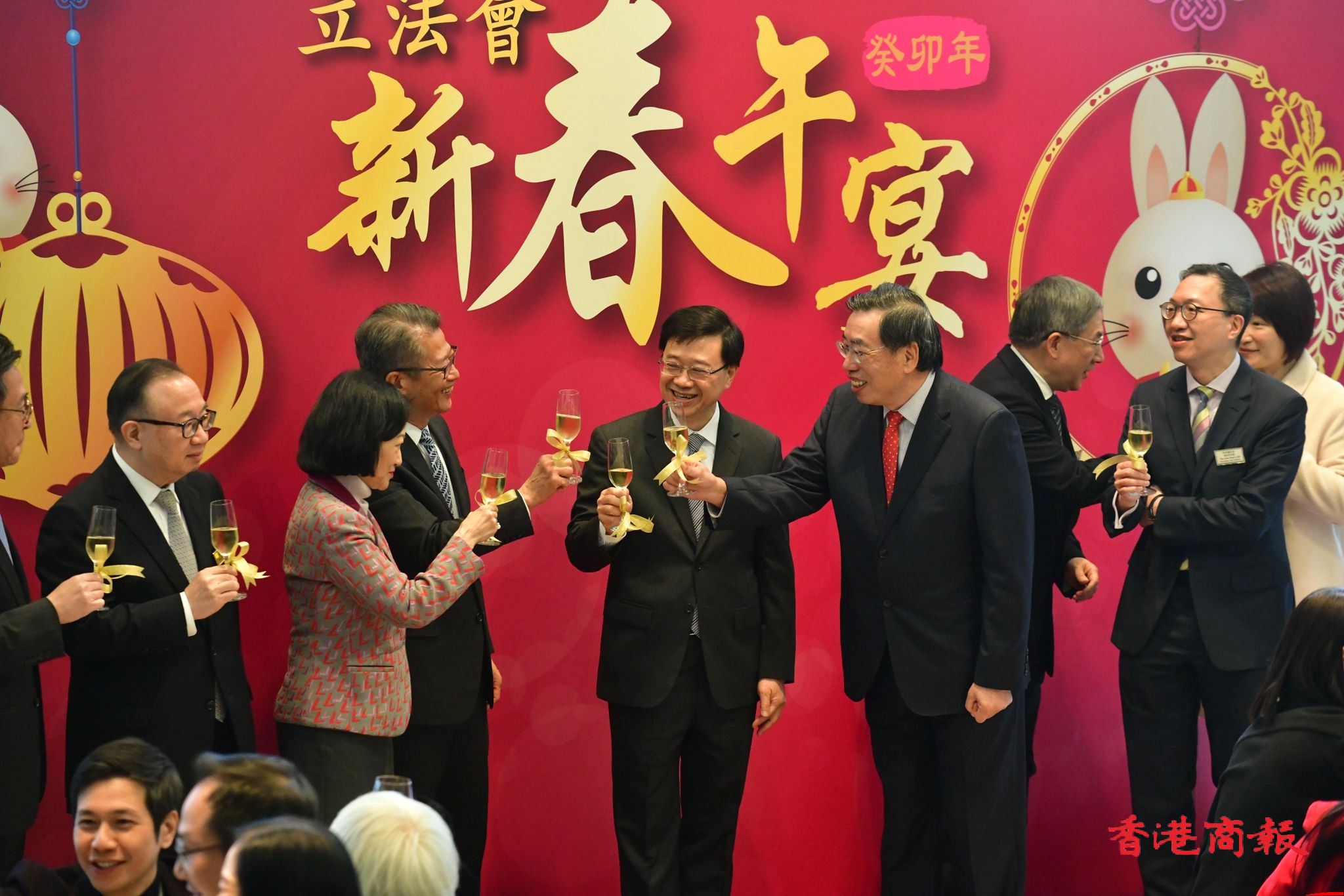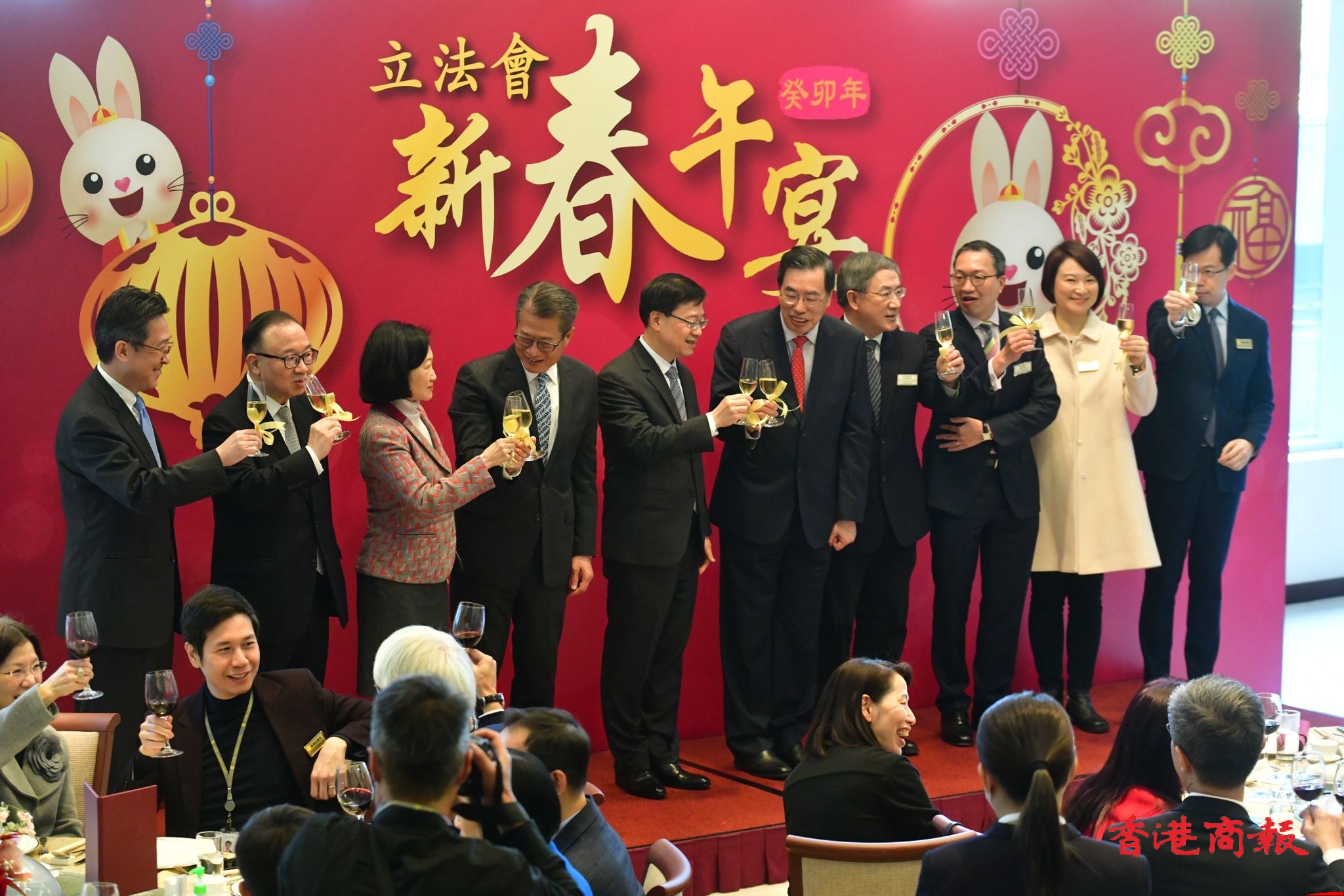 立法會今日(17日)舉辦新春午宴,共192人出席,包括行政長官李家超、立法會主席梁君彥,出席人數是歷來之冠。眾人先在大堂合照及切燒豬,之後到宴會廳進行午宴。梁君彥說行政立法機關攜手創造歷史,象徵行政立法關係良性互動,踏上新台階。