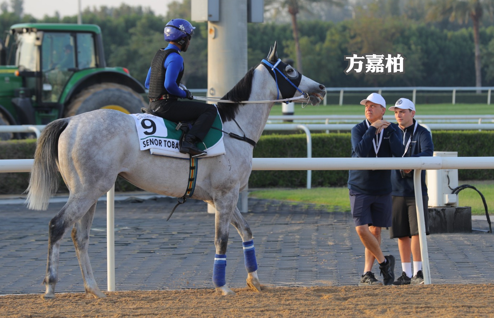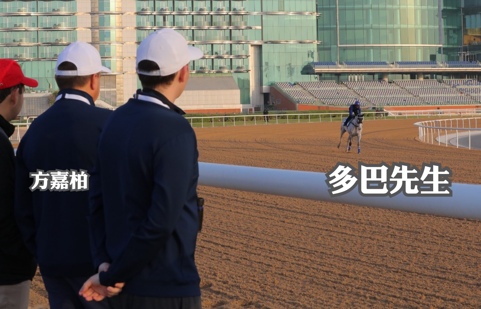 那邊廂,同跑第八場一級賽2410米草地杜拜司馬經典賽的韋廄「將王」、方廄「多巴先生」,亦於同時間一齊出操,前駒續由練馬師韋達主課,人馬在泥地跑道慢跳,然後慢慢踱步返回馬房,可說是已做好完整備戰,迎接明日大戰。後駒由助手於泥地跑道慢跳,方嘉柏與兒子早在欄邊睇實操練過程,及後隨即上前接馬,並與鞍上人交談一輪,動態認真。(文、影片編輯:志誠 ;圖、影片:特約記者胡迪)