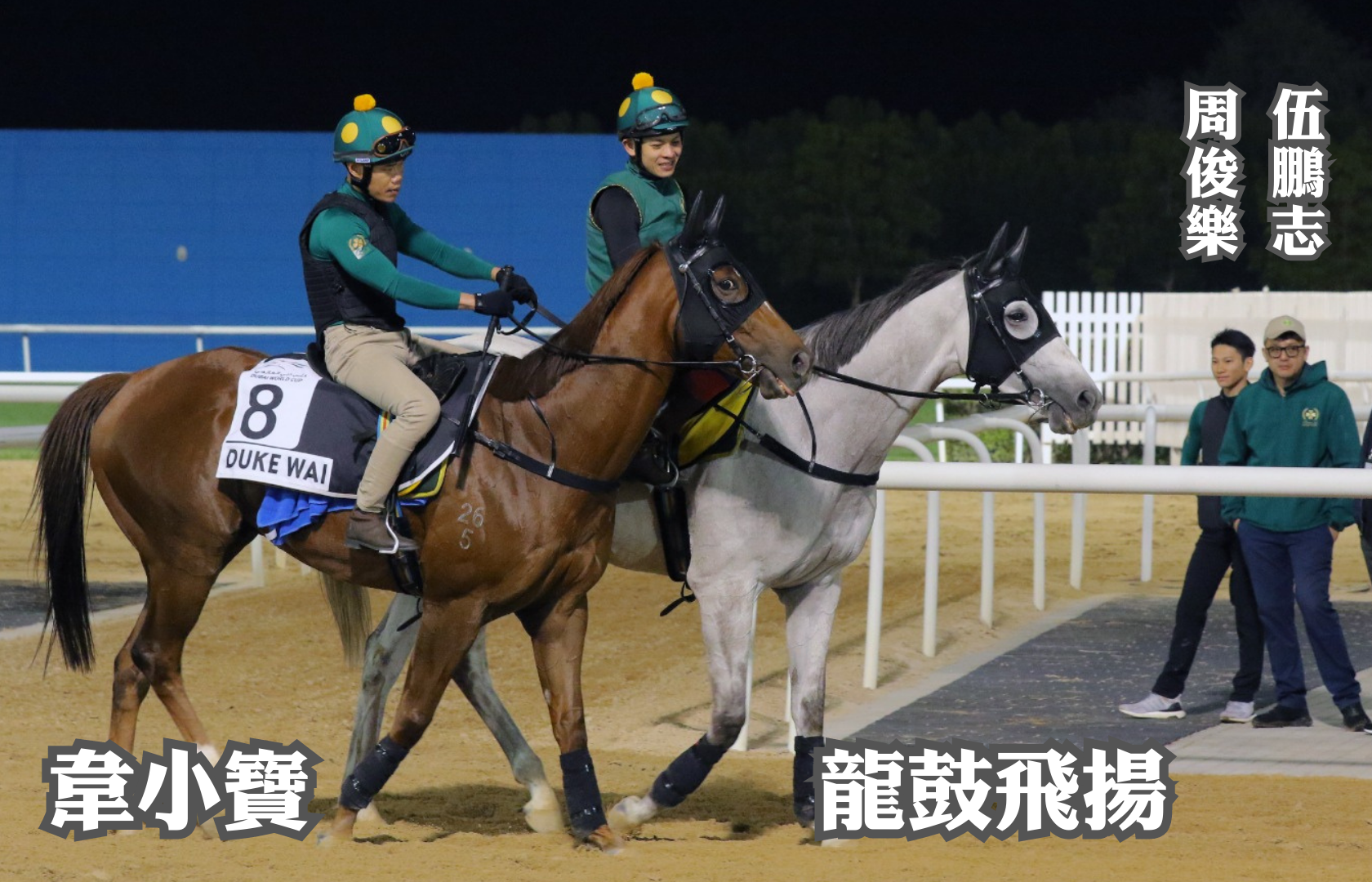 杜拜世界盃賽馬日明日(25日)在美丹馬場舉行,5匹港隊賽駒今日(24日)作最後檢閱。伍廄「韋小寶」、「龍鼓飛揚」繼續「打孖」操練,引入前駒的馬販周邦華、以及騎師周俊樂今早一同露面,鞍上人表示「韋小寶」排七檔理想,希望可在賽事中緊隨領放馬兩個馬位之後,再求伺機而動。